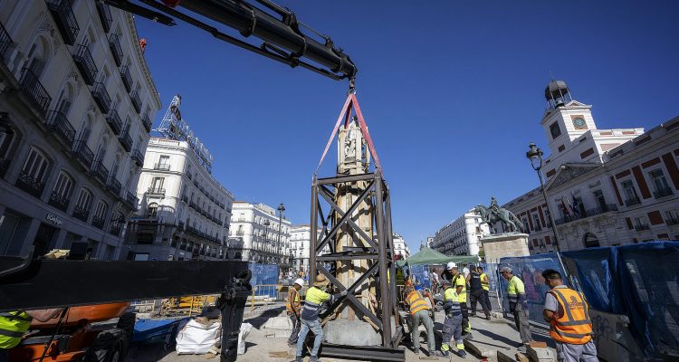 Si bien la ubicación fue desde el punto de vista histórico la más adecuada, en aquella ocasión colisionaba con la proximidad de un conjunto de paradas de autobús que impedían su correcta contemplación. Por ello, con motivo de las obras del intercambiador ferroviario que tuvieron lugar desde 2004, la estatua se desmontó en abril de 2006 y fue conservada en los almacenes municipales hasta que en septiembre de 2009 se colocó en la confluencia de la calle Arenal con la Puerta del Sol.