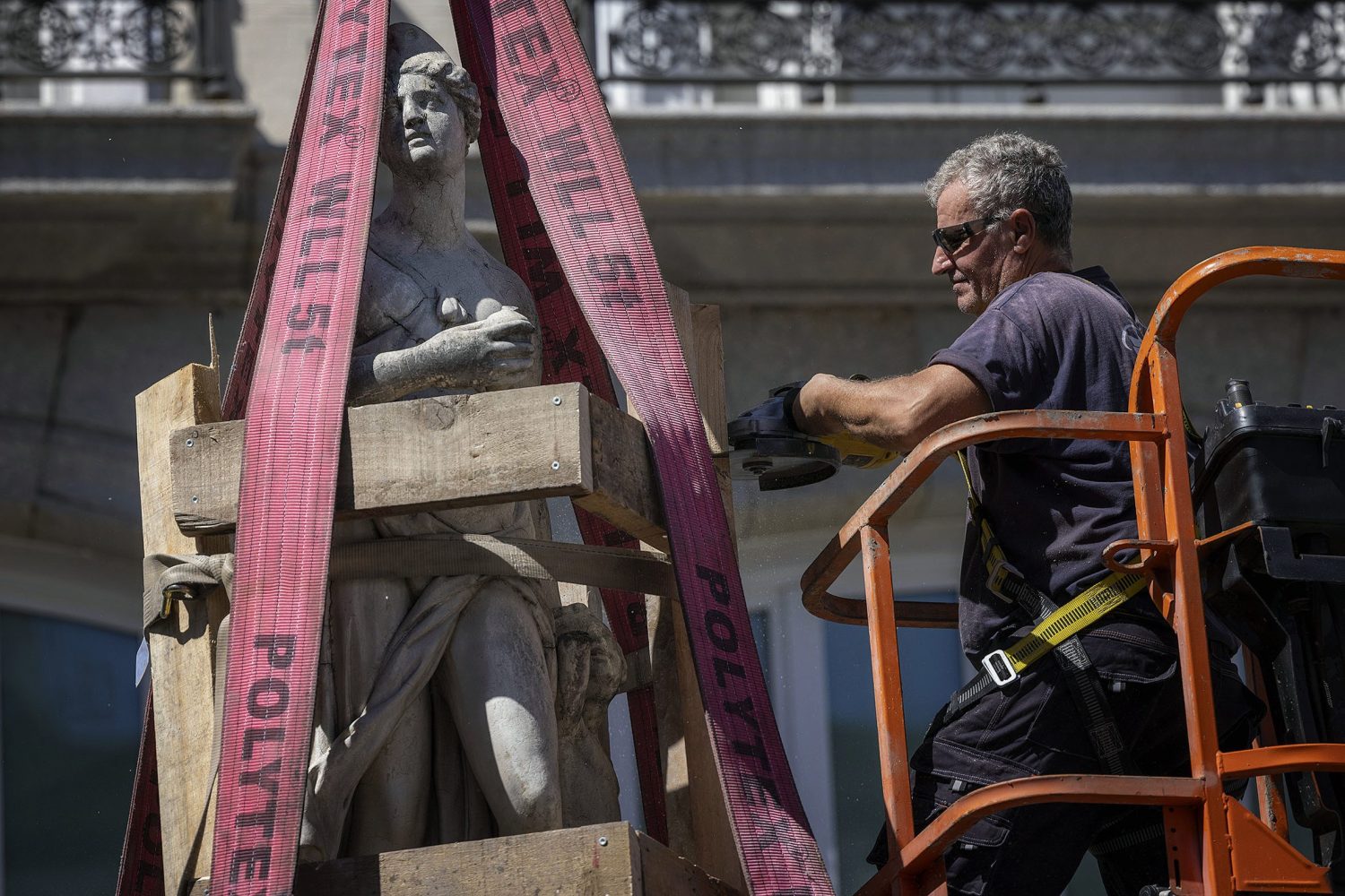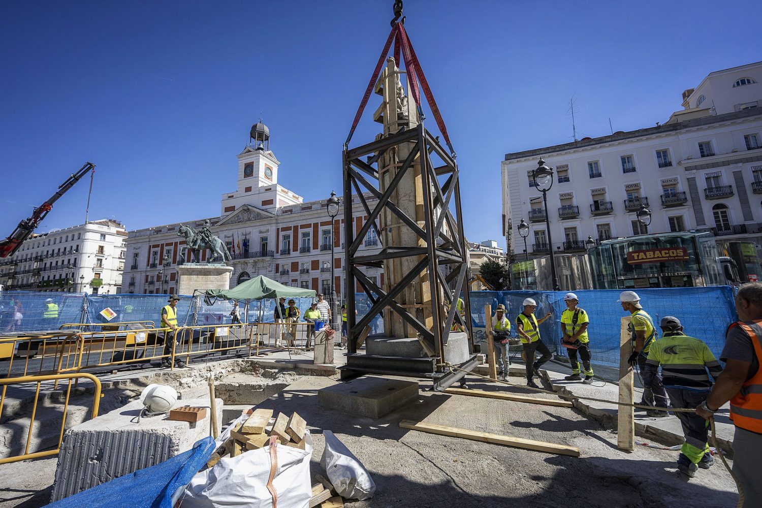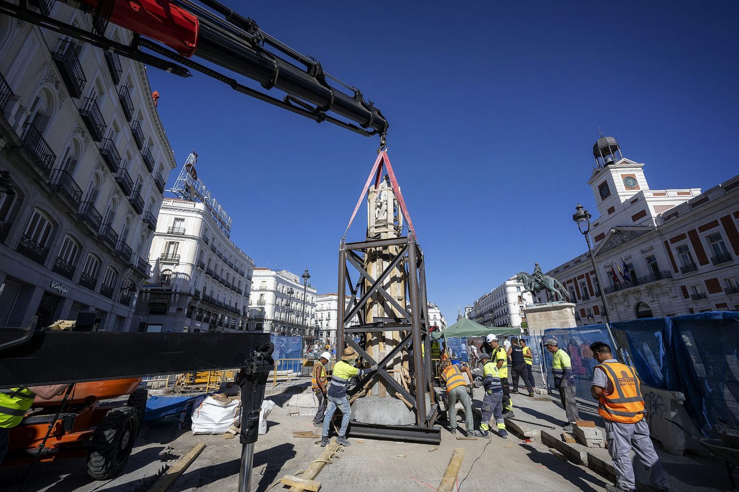 La estatua de la Mariblanca ha sido trasladada esta tarde a su nueva ubicación en la Puerta del Sol. La escultura, que se ha desplazado 18 metros respecto de su emplazamiento anterior, ocupará a partir de ahora el extremo occidental de la nueva alineación de bancos situada en el arco norte de la plaza.