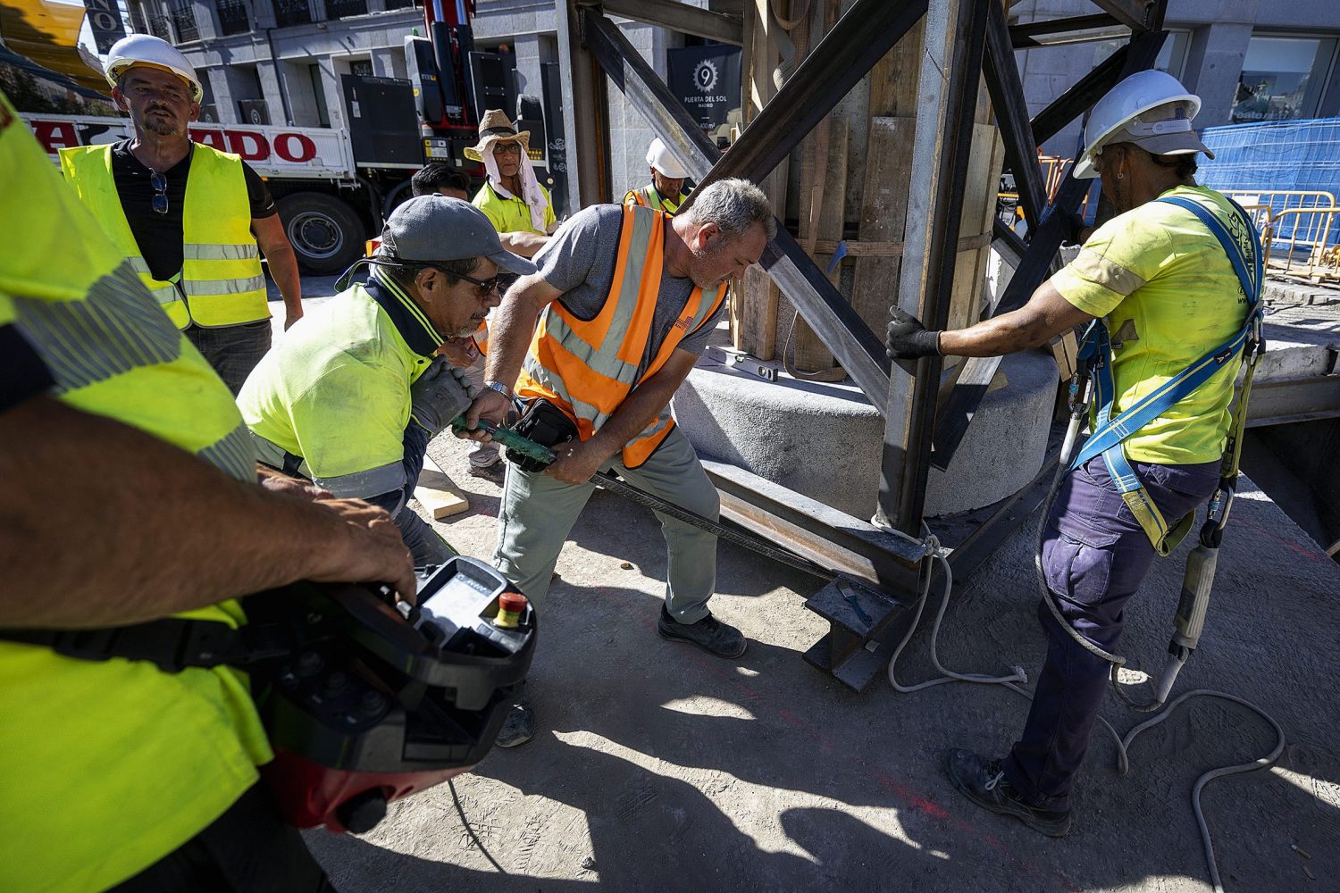 La reubicación forma parte de los trabajos que se están llevando a cabo este verano una vez obtenidos los preceptivos permisos de Metro. En este caso, el traslado de la estatua requería dicho permiso por situarse junto a una rejilla de ventilación del suburbano que ha tenido que ser sustituida por no cumplir las condiciones necesarias de seguridad. El resto de trabajos que dependían de los permisos de Metro, quedarán finalizados antes de que concluya el mes de agosto. De esta manera, a partir de septiembre quedarán pendientes en la plaza dos actuaciones para las que el Consistorio aun no dispone de autorización por parte de Adif: el acceso a Cercanías y su ascensor.