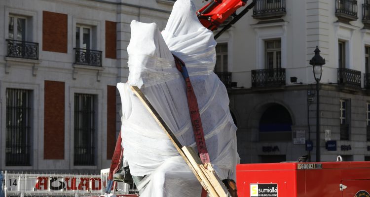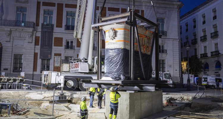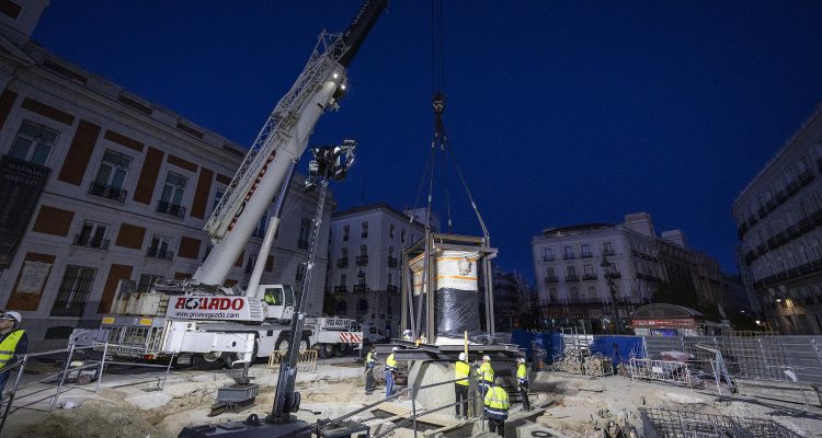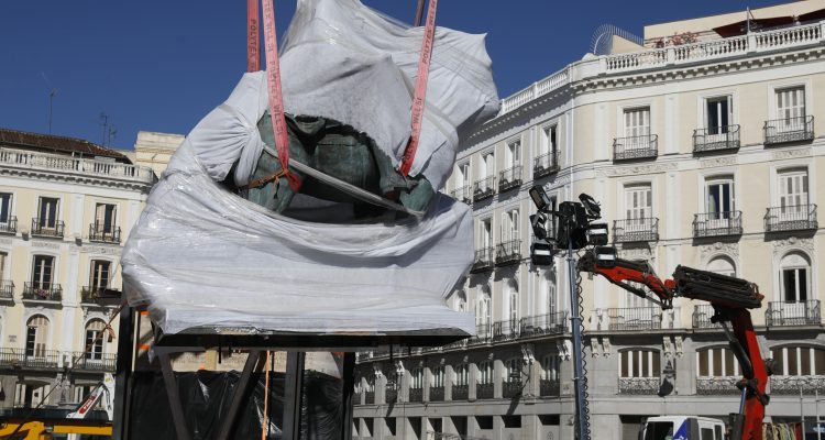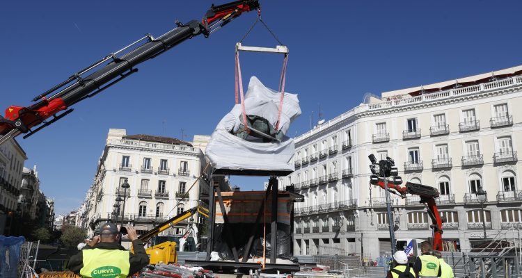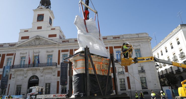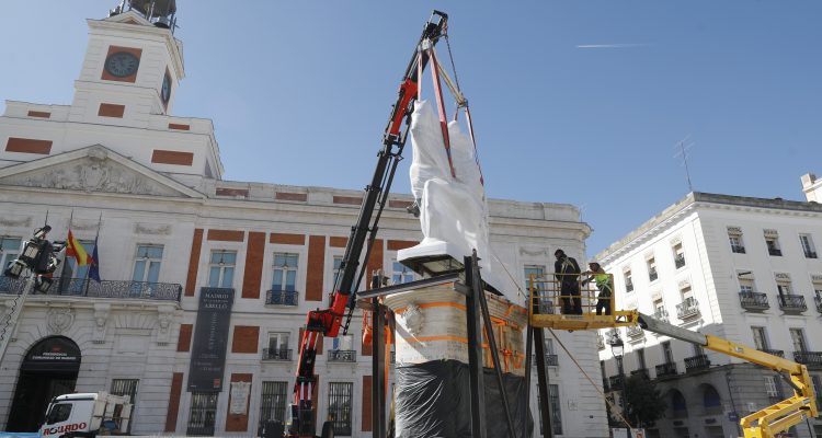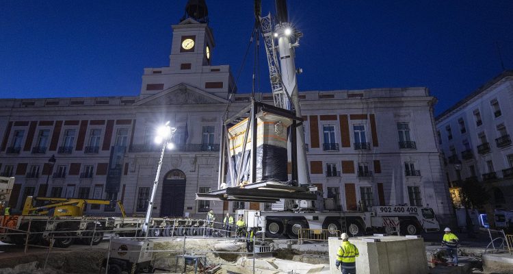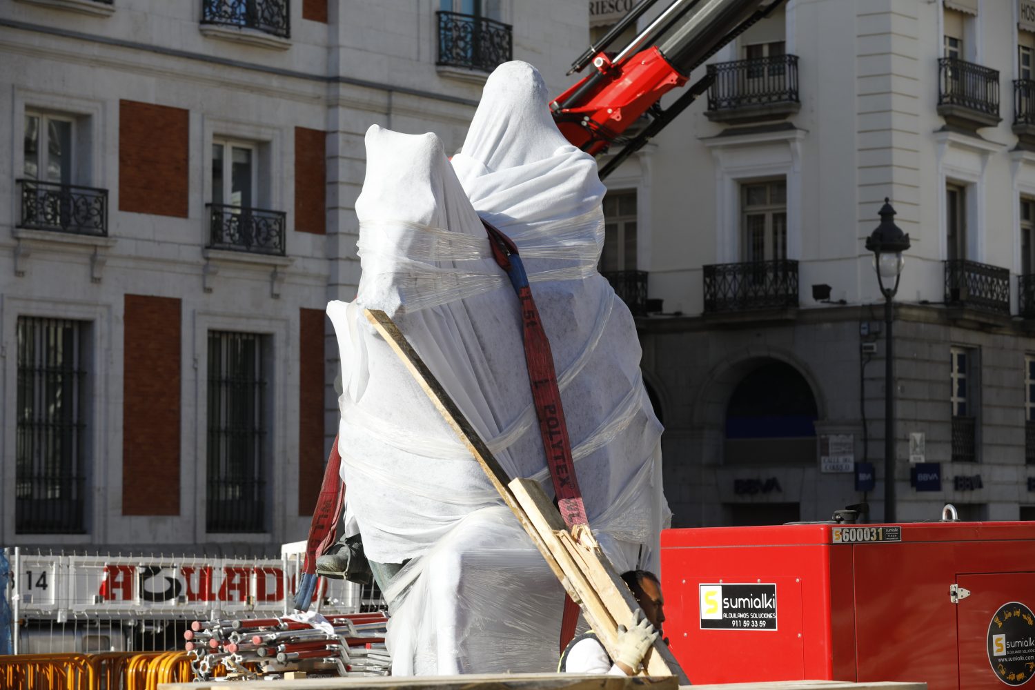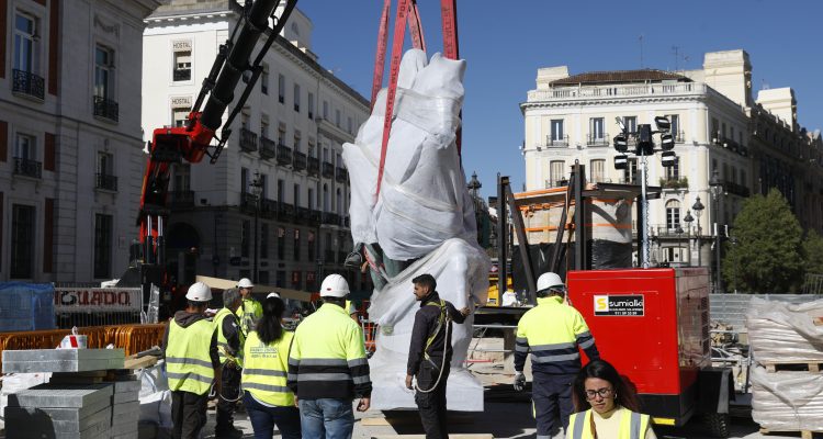 La estatua ecuestre de Carlos III ha sido trasladada a su nueva ubicación en el marco de las obras de remodelación de la Puerta del Sol. El cambio de emplazamiento ha requerido de unas complejas maniobras que se han alargado durante dos jornadas y se han completado esta mañana.