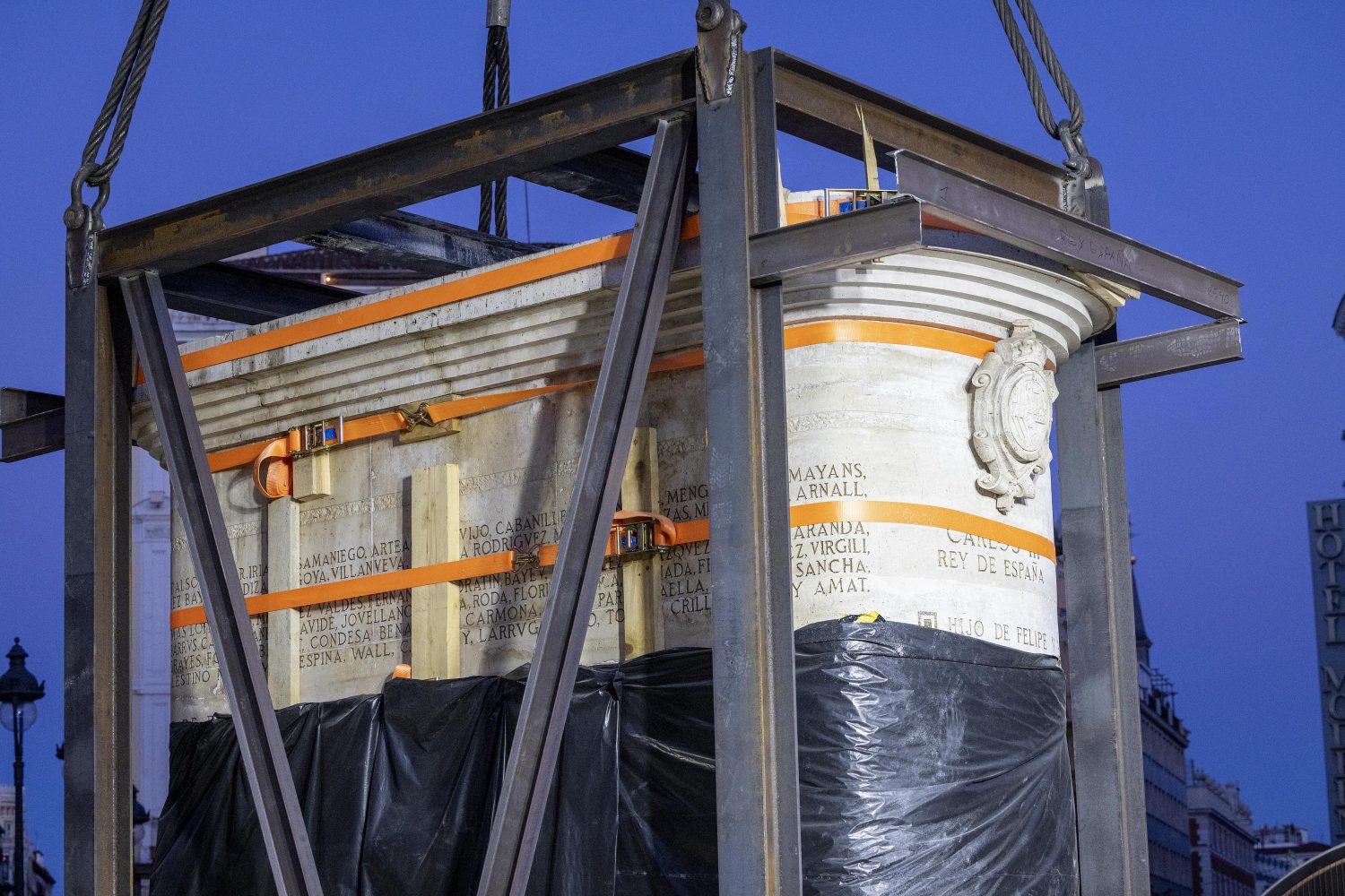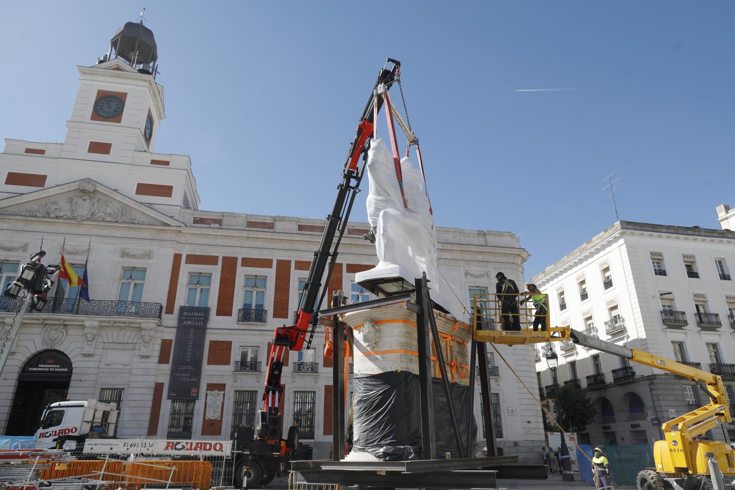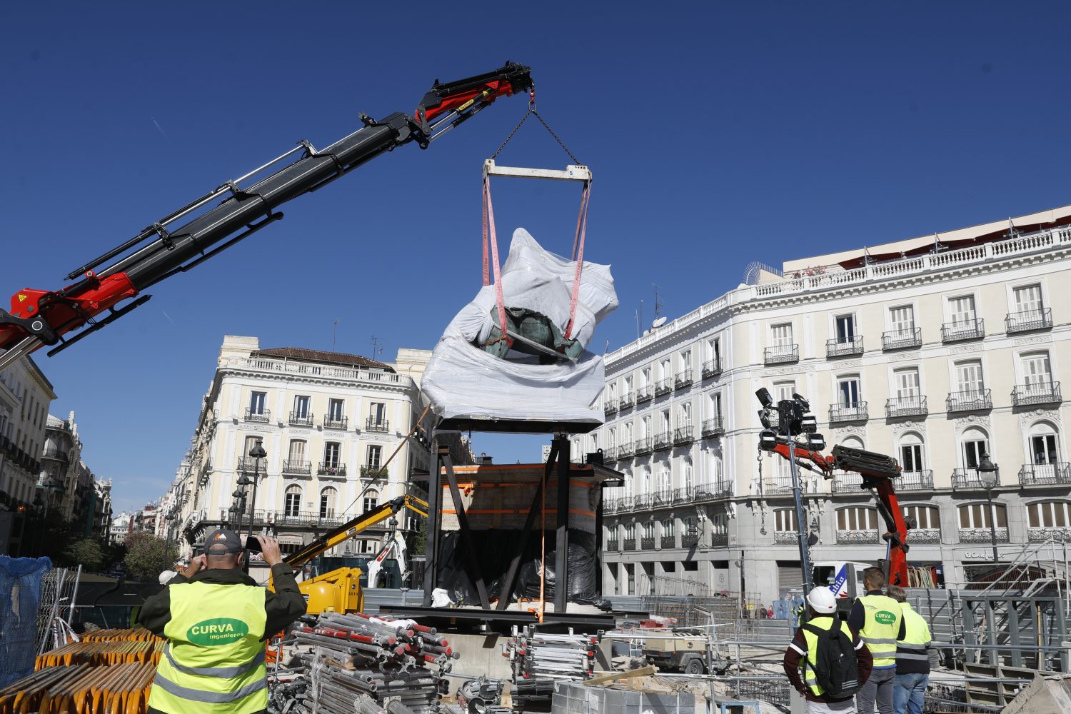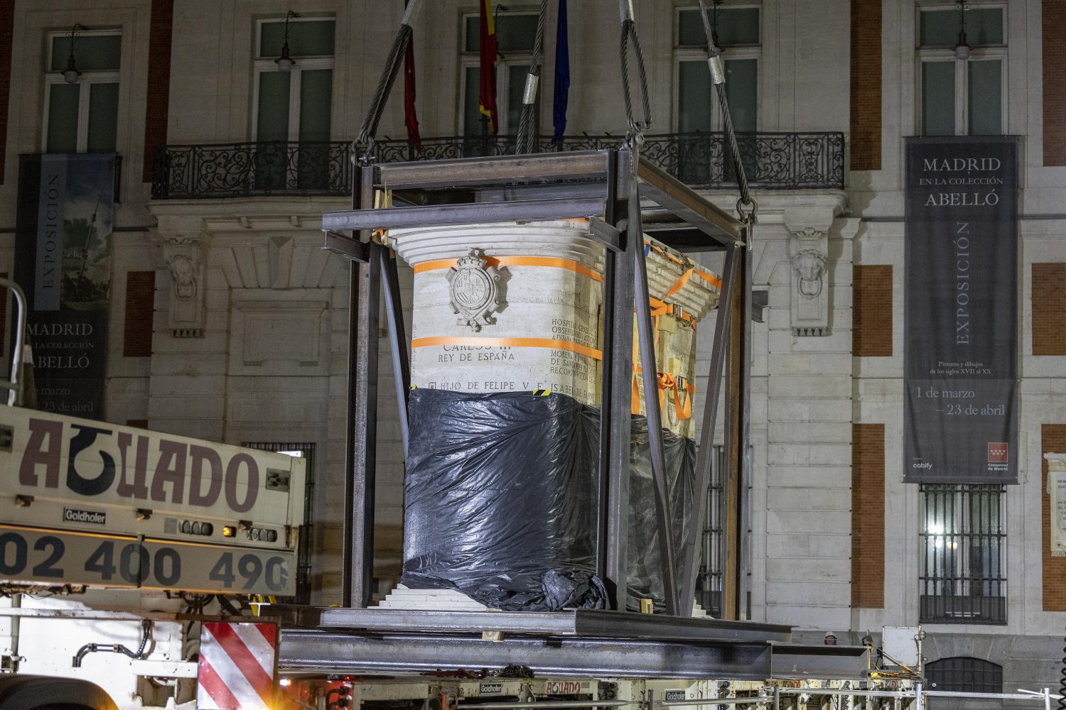 La estatua ecuestre de Carlos III ha sido trasladada a su nueva ubicación en el marco de las obras de remodelación de la Puerta del Sol. El cambio de emplazamiento ha requerido de unas complejas maniobras que se han alargado durante dos jornadas y se han completado esta mañana.
