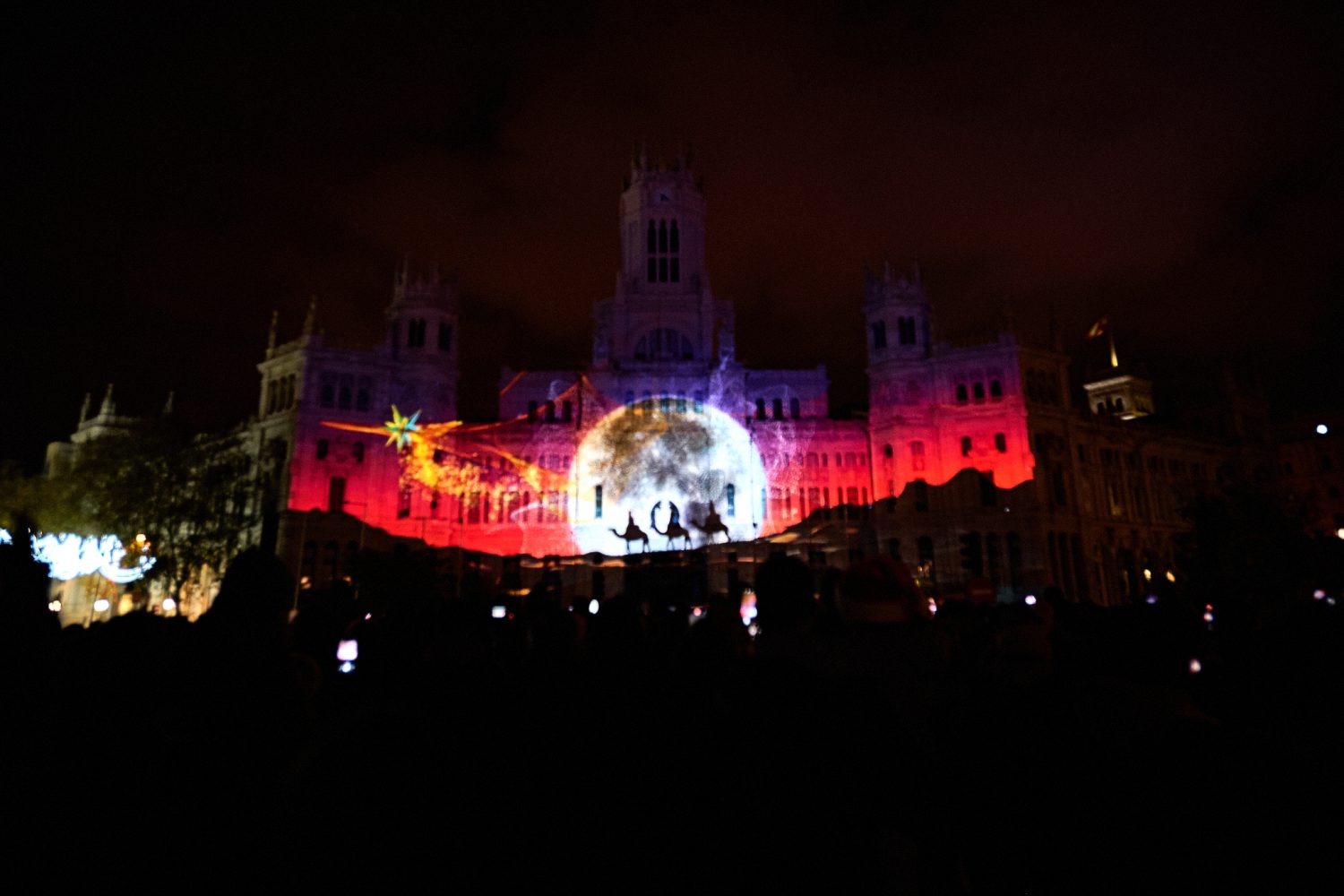 El Palacio de Cibeles se transformó la tarde de ayer en un espectacular christmas navideño con el que el Consistorio ha querido felicitar la Navidad. Durante ocho minutos, la Estrella de Belén, acompañada de dos ángeles, condujo a los miles de espectadores congregados en la plaza de Cibeles por un emocionante recorrido por la historia de la Navidad, que fue proyectado en la fachada de la sede del Ayuntamiento de Madrid a través de un videomapping en tres dimensiones, con efectos especiales y música.