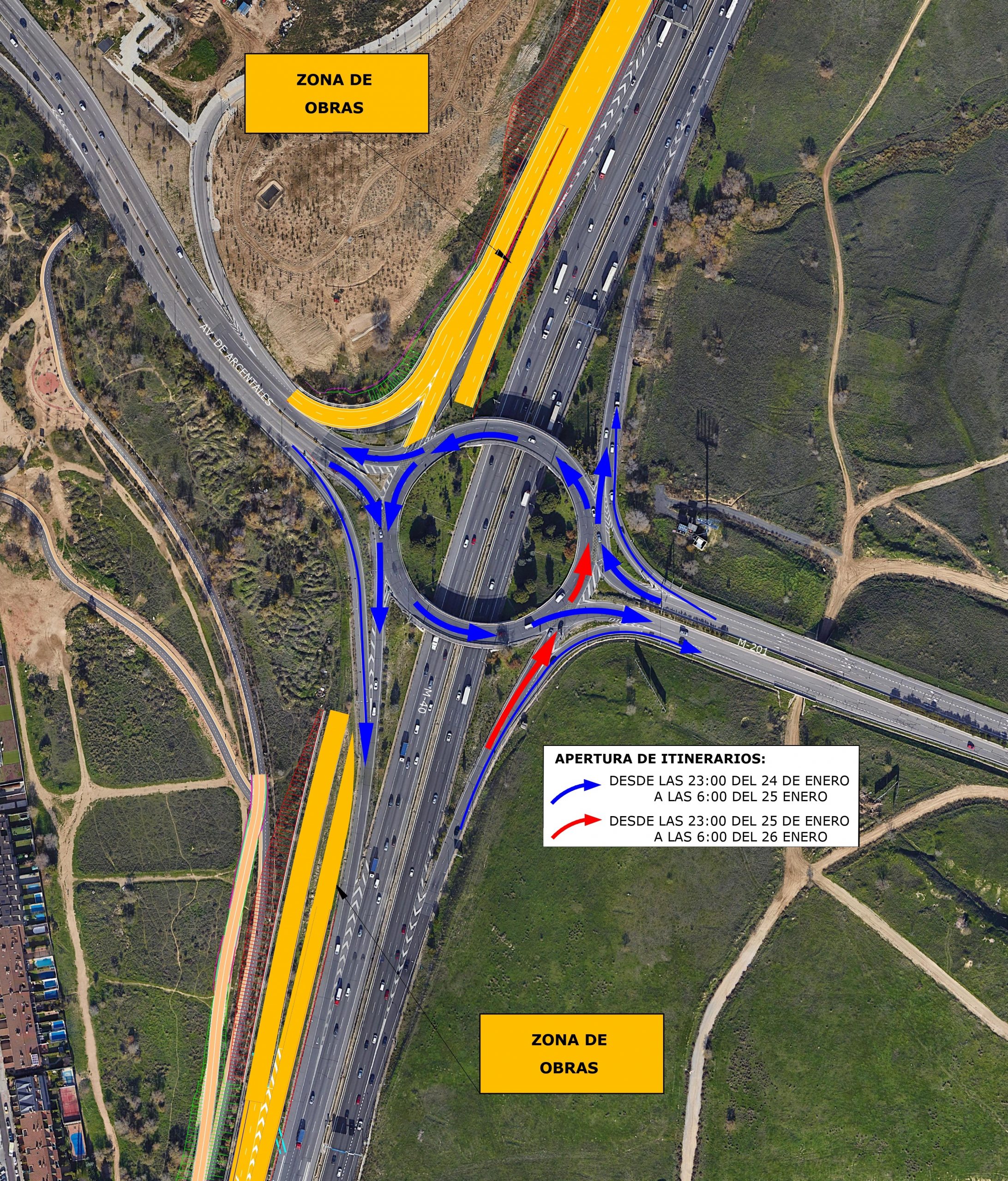 La reapertura de la glorieta se llevará a cabo en dos fases. A partir de las 6:00 h de mañana jueves, se permitirá el acceso a la glorieta desde la M-40 Sur únicamente para dirigirse a la M-201 dirección Coslada y desde la M-201 para acceder a la M-40 en ambos sentidos. Un día después, el viernes 26 de enero, a partir de las 6:00 h, se permitirán los mismos movimientos que el día anterior y se añadirá la posibilidad de acceder a la glorieta desde la M-40 Sur para dirigirse a la avenida de Arcentales.