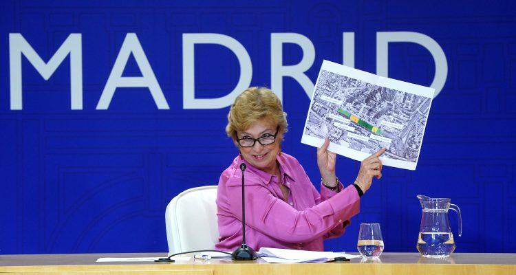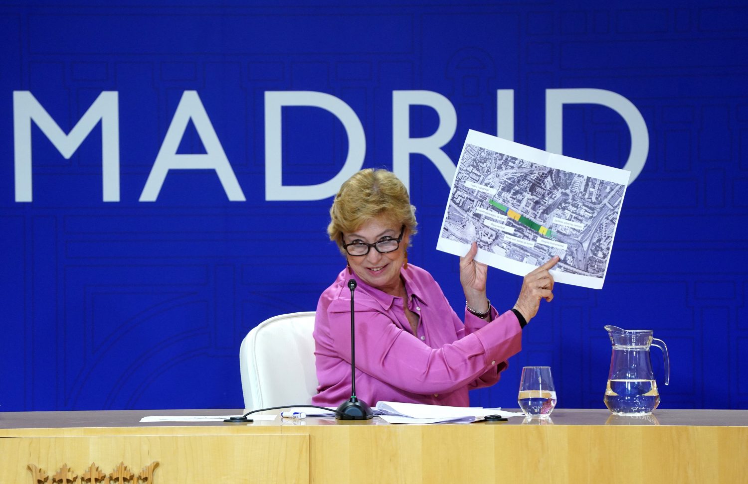 García Romero, delegada de Obras y Equipamientos, en la rueda de prensa posterior a la Junta de Gobierno. Plano de zonificación y sección del túnel de la Castellana