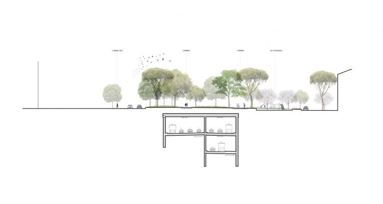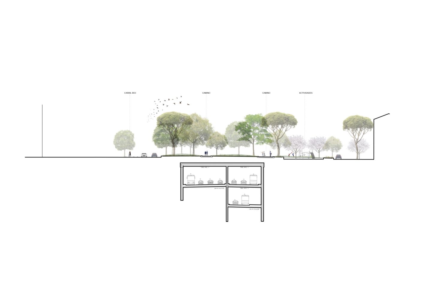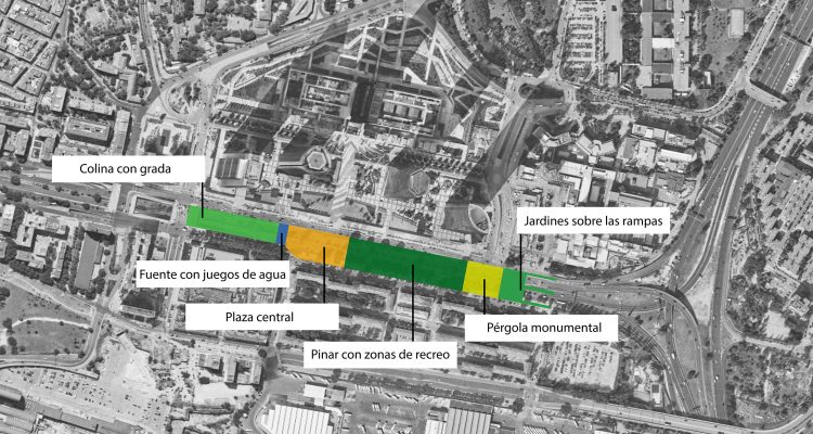 El espacio generado sobre el túnel estará compuesto de varias zonas, todas ellas rodeadas de una arboleda perimetral bajo la que se dispondrán los elementos de mobiliario urbano como bancos, papeleras o fuentes de beber. En total, está previsto plantar alrededor de 670 árboles.