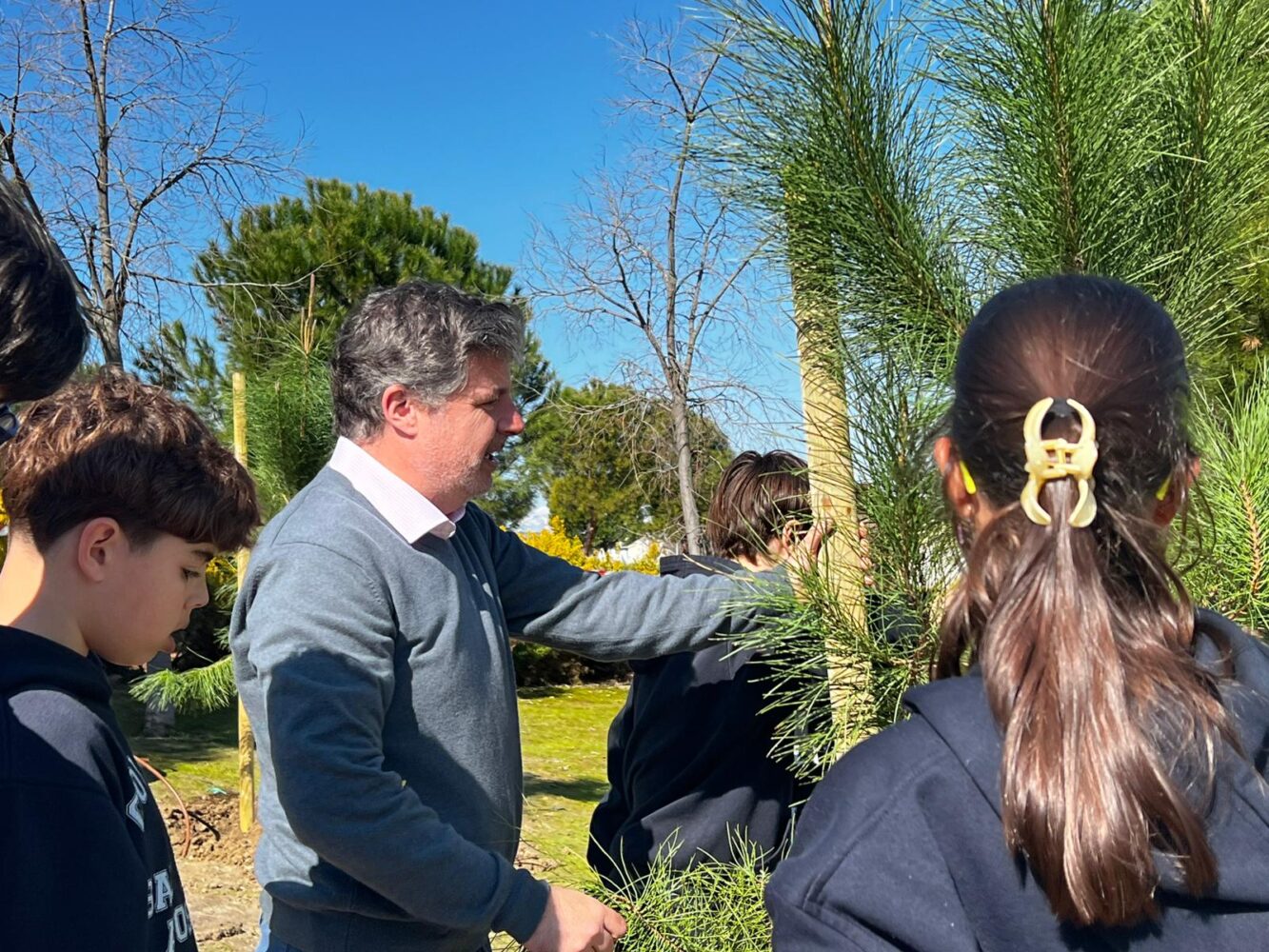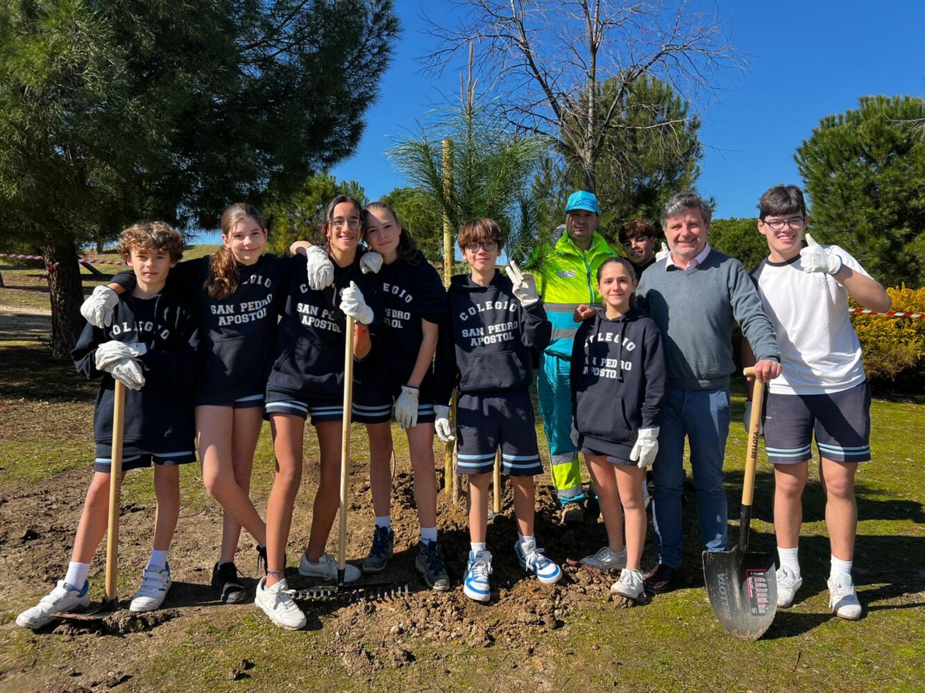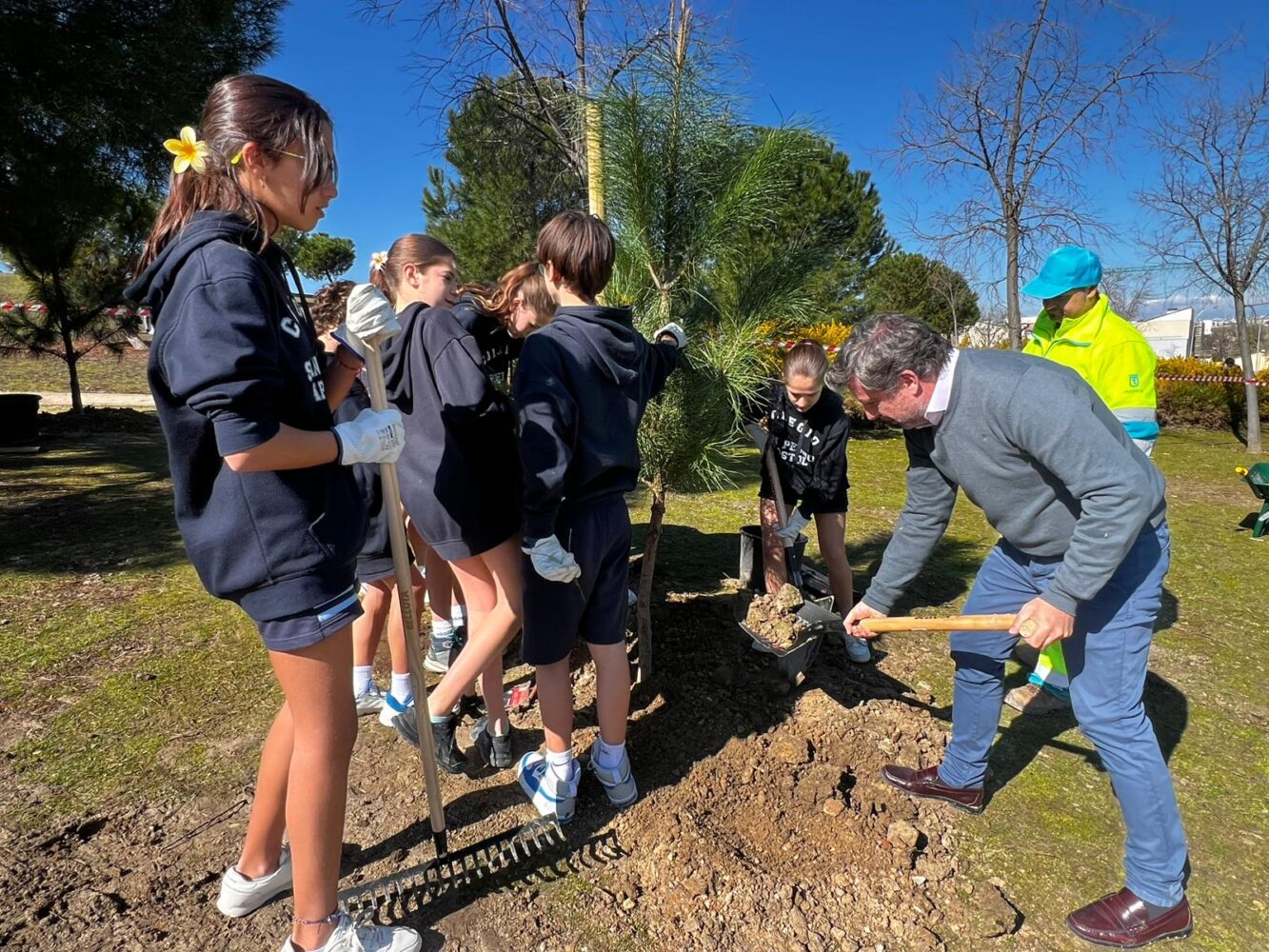 La Junta Municipal de Barajas ha celebrado hoy el Día del Árbol con la plantación de 40 ejemplares —30 pinos piñoneros y 10 moreras sin frutos— en la zona verde junto al área infantil de la calle de Alcañiz. Han participado en la actividad 75 alumnos de 1º de ESO del Colegio San Pedro Apóstol.