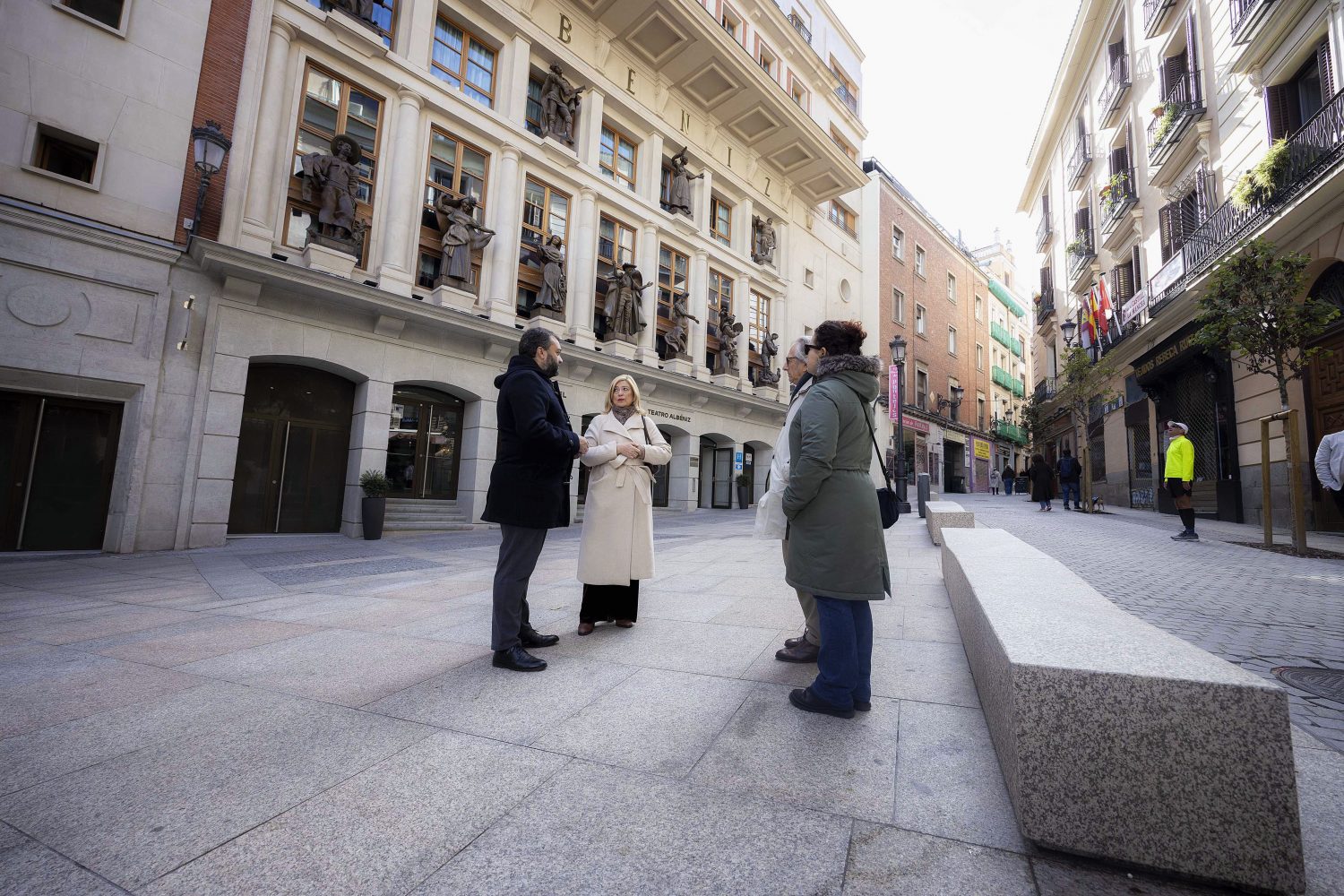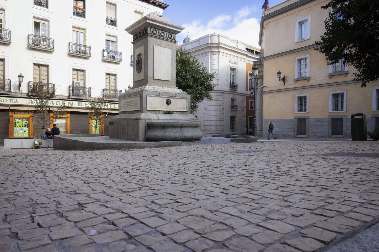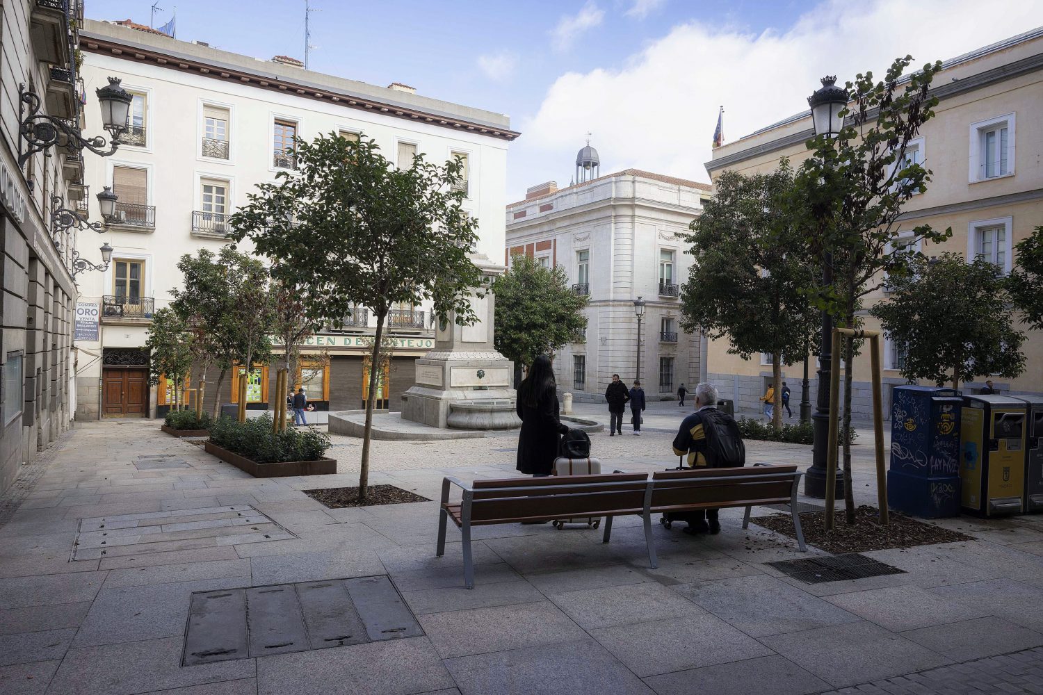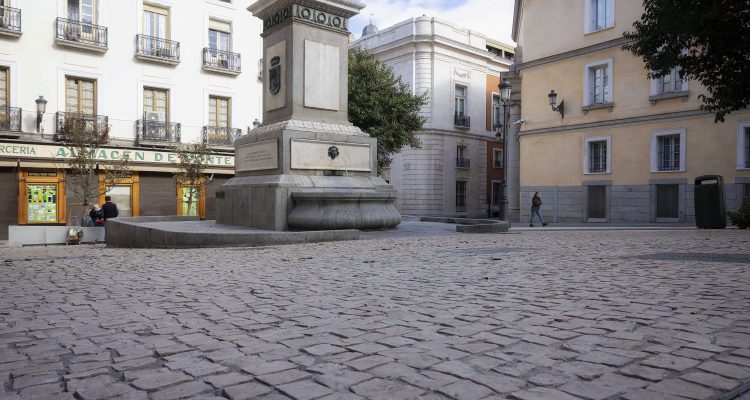Otra de las actuaciones destacables del proyecto ha sido la realizada en la confluencia de la calle de la Paz y la plaza de Pontejos. En este punto se produce un ensanchamiento que configura una pequeña plaza triangular junto al teatro Albéniz. Ahora este espacio conforma una antesala del teatro más acogedora, especialmente para los usuarios del teatro, y en la que se ha dispuesto nuevo arbolado, iluminación y mobiliario urbano.