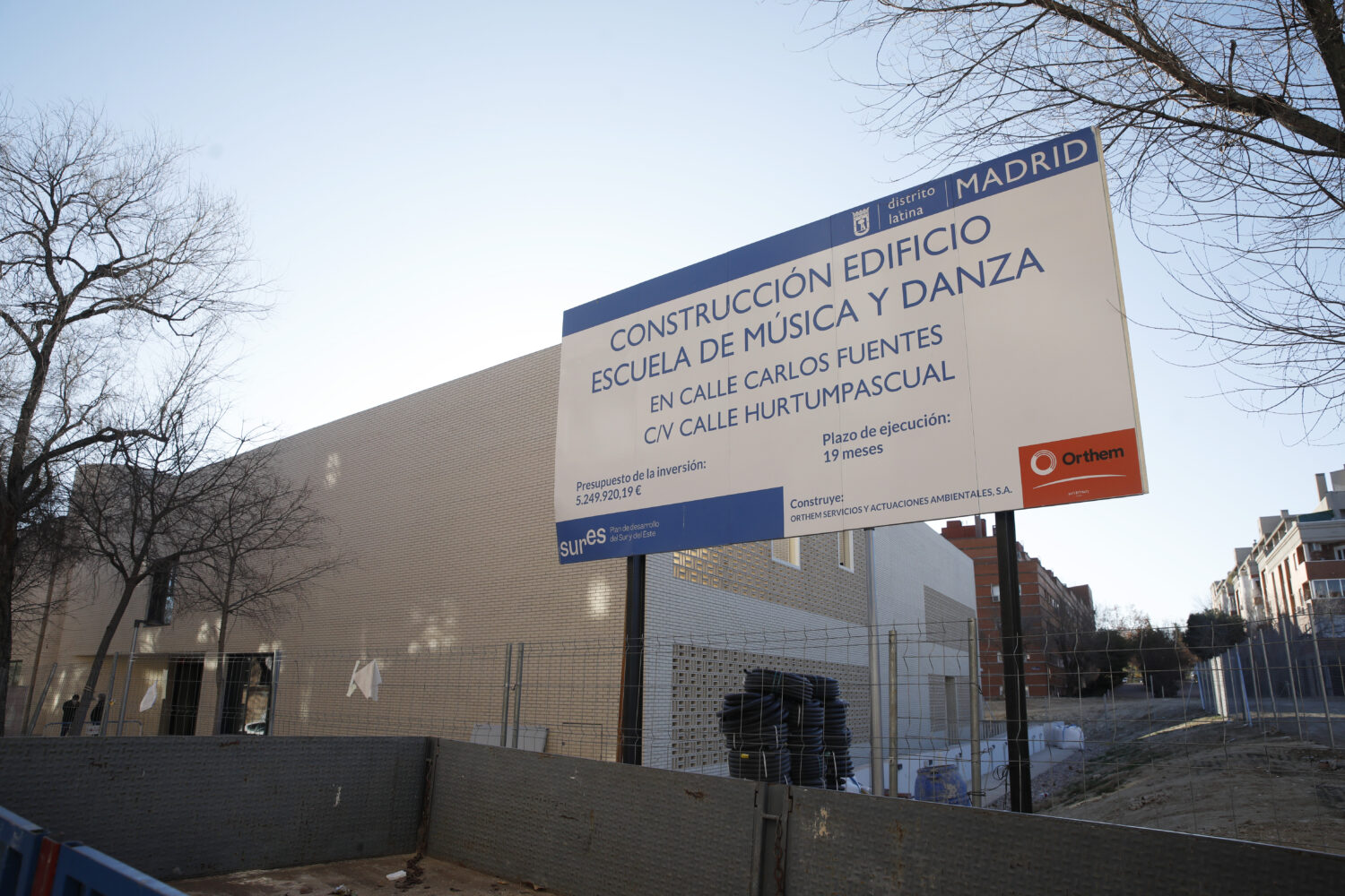 El delegado de Políticas Sociales, Familia e Igualdad, José Fernández, y el concejal de Latina, Alberto González, han visitado hoy las obras de construcción de la primera Escuela Municipal de Artes Escénicas, que se encuentran en su fase final. El nuevo recurso se ha configurado como un espacio único, moderno y versátil que combinará la enseñanza práctica de cuatro disciplinas artísticas: música, danza, creación digital sonora y teatro. El equipamiento entrará en funcionamiento el próximo año y tendrá una capacidad de 800 alumnos matriculados, aunque se espera que pueda atender a más de 1.000 personas mediante talleres y clases complementarias en diferentes horarios.