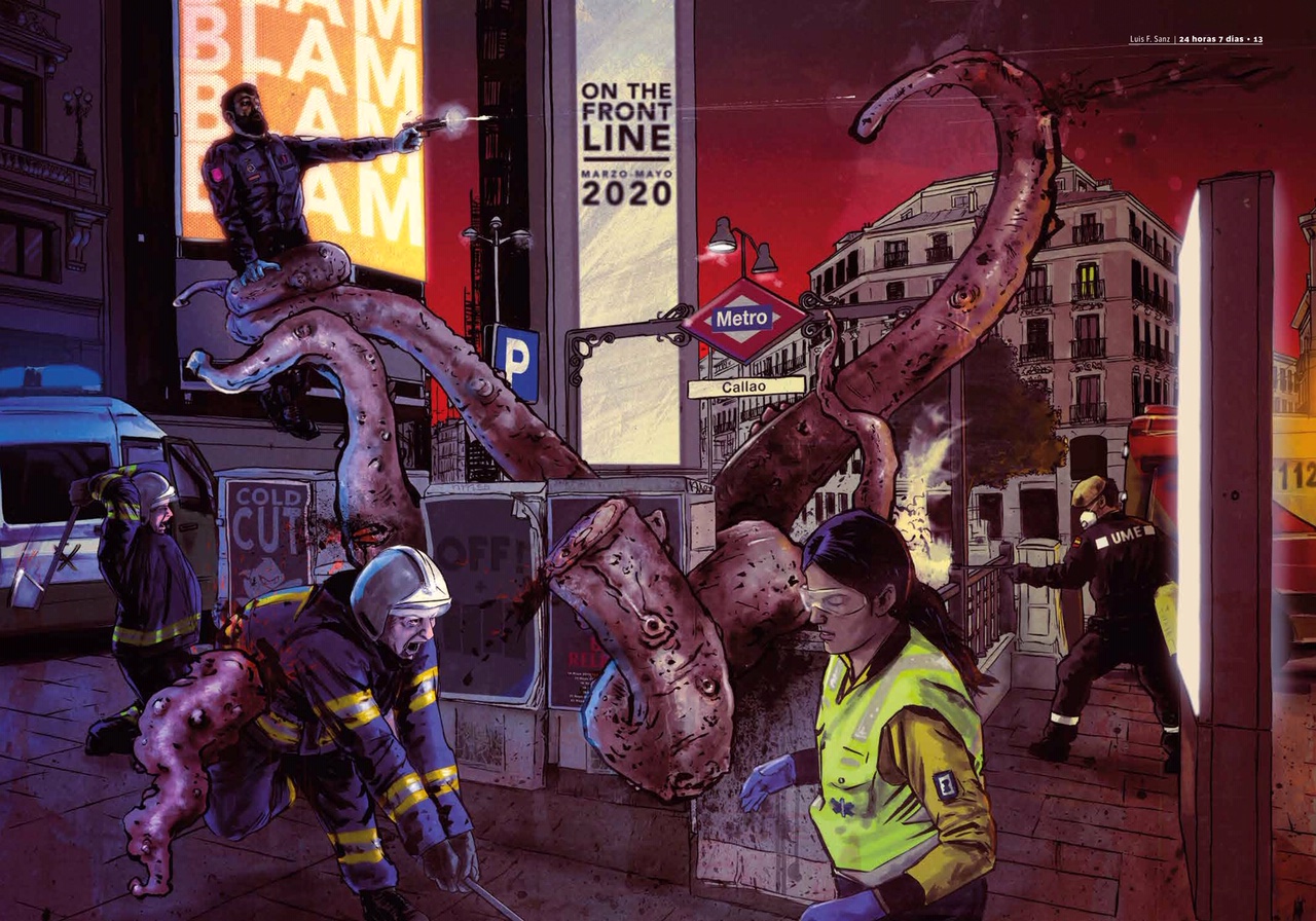 En el homenaje ilustrado a todos los héroes sin capa, Sr. García recuerda a ‘todos y cada uno de vosotros que habéis sido esenciales’; Luis F. Sanz representa a los cuerpos de seguridad y emergencia combatiendo contra el virus como un monstruo apocalíptico; Beatriz Ramo (Naranjalidad), la importancia de los servicios públicos de transporte que te llevan donde pienses y mientras Violeta Lópiz plasma los servicios de limpieza de día, Raúl Arias lo hace con la recogida de residuos de noche; Kike de la Rubia recoge la fundamental cadena alimentaria hasta llegar a los supermercados y la variedad de productos y de colorido de los mercados municipales aparece de la mano de Irene Blasco; Silja Goetz se detiene en la labor de tantos profesores en esta experiencia educativa inédita y las propuestas de todo #loquehagafaltapormadrid, lema del Foro de Empresas, van de la mano tanto de Ana Galvañ como de Mar Blanco.