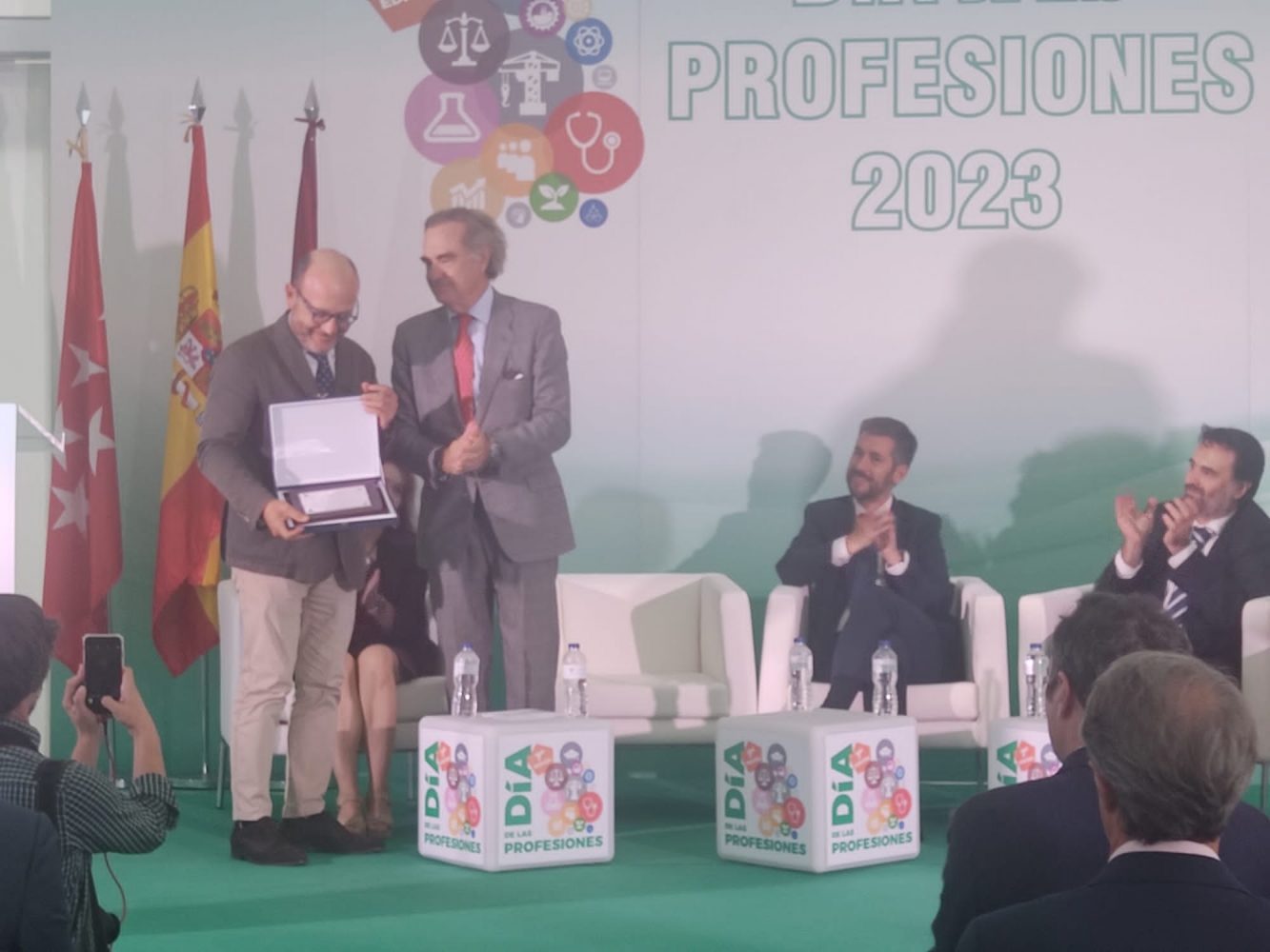 El delegado de Políticas Sociales, Familia e Igualdad, José Fernández, ha recibido hoy una Mención Especial en los Premios Oro UICM 2023, promovidos por la Unión Interprofesional de la Comunidad de Madrid y entregados en el acto de clausura del Día de las Profesiones que también organizan. El jurado, compuesto por su Junta Directiva, le reconoce su “gran labor desempeñada como concejal-presidente del distrito de Salamanca fomentando el asociacionismo y por el extraordinario apoyo que ha prestado a los Colegios Profesionales para que la gran cita anual de las profesiones pudiera celebrarse por primera vez en un espacio público, en la madrileña Plaza de Colón”.