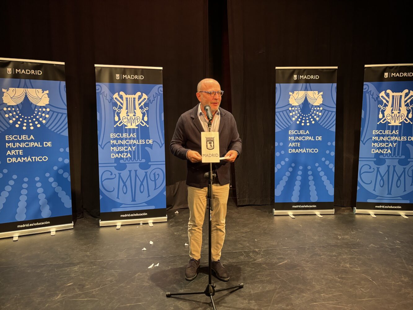 El delegado de Políticas Sociales, Familia e Igualdad, José Fernández, acompañado por el concejal de Centro, Carlos Segura, ha inaugurado hoy el curso 2025-2026 de las 16 escuelas municipales de música y danza y de la Escuela Municipal de Arte Dramático. En un acto celebrado en esta última, Fernández ha informado de que la oferta en estos 17 centros supera este año académico las 9.750 plazas, consolidando así la apuesta del Ayuntamiento de Madrid por la enseñanza artística. Como novedad, el delegado ha anunciado la puesta en marcha de Aula 60, un programa de formación en teatro dirigido a personas mayores de 60 años.