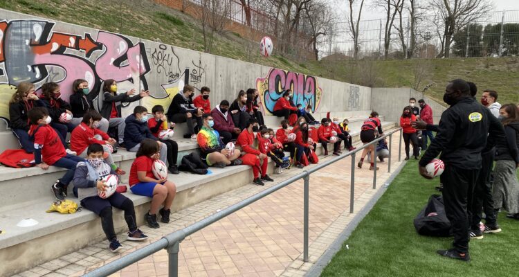 La concejala delegada de Deporte, Sofía Miranda, ha asistido esta tarde a la clase magistral que diferentes jugadores internacionales de rugby 7, participantes del ‘Madrid Rugby 7s International Tournament’, han impartido a los niños de la Escuela Municipal de Rugby Vallecas Rugby Unión.