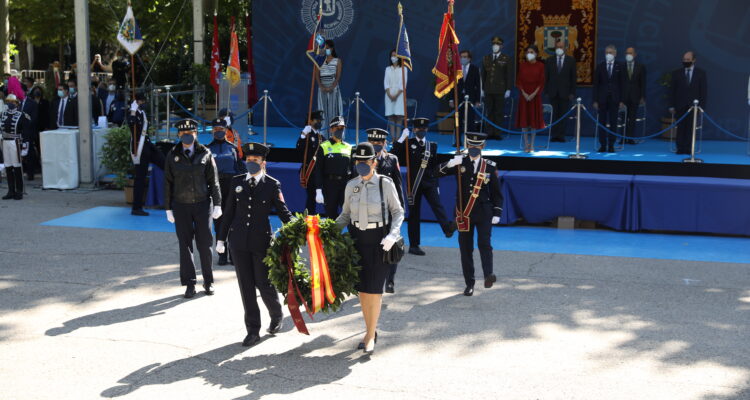 De igual forma, el homenaje a los agentes fallecidos en acto de servicio con la ofrenda de una corona de laurel en su memoria lo realizado mujeres policías de diversas unidades, algunas vistiendo el uniforme de 1971, año en el que accedieron las primeras mujeres a la Policía Municipal de Madrid.