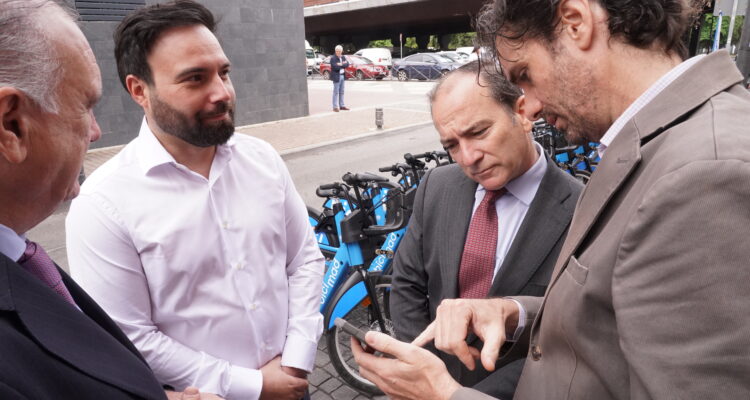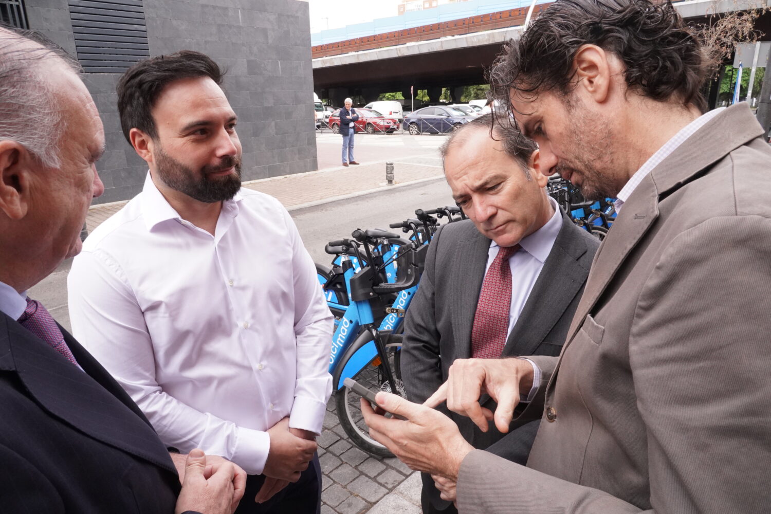 El delegado de Urbanismo, Medio Ambiente y Movilidad, Borja Carabante, acompañado por el concejal de Puente de Vallecas, Ángel Niño, ha inaugurado esta mañana la primera estación virtual de bicimad. Situada en el distrito de Puente de Vallecas, esta nueva ubicación estratégica se sitúa en un enclave en el que confluyen distintos modos de transporte: autobús, metro y bicimad.