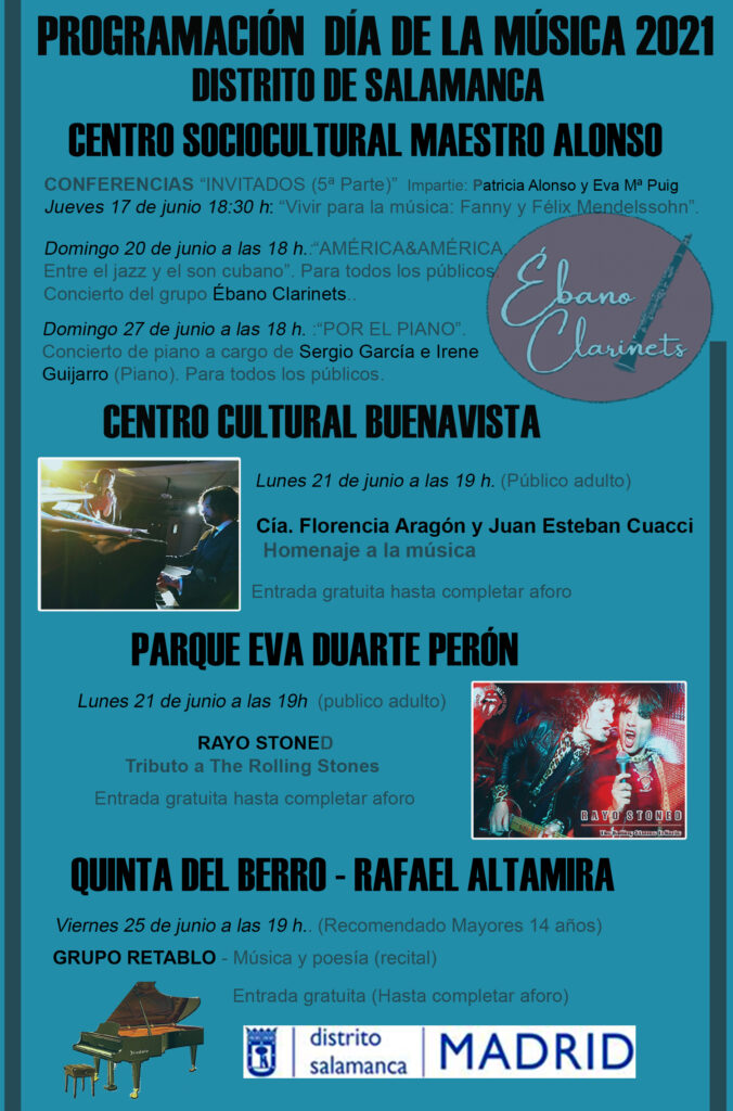 Coincidiendo con la conmemoración del Día de la Música, desde mañana día 17 y hasta el próximo 25 de junio, el distrito de Salamanca organiza actividades para celebrar esta efeméride. Los tres centros culturales y el parque Eva Duarte del distrito acogen en sus dependencias diferentes propuestas de carácter gratuito para acercar los diversos estilos musicales a todos los públicos.