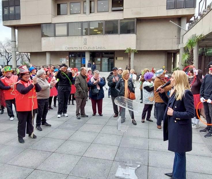 La concejala de Ciudad Lineal, Nadia Álvarez, ha celebrado el carnaval junto con los socios de los ocho centros municipales de mayores del distrito en la plaza donde se ubica la sede de la junta municipal. “El carnaval es una ocasión única para disfrutar, inventar y sacar la creatividad que todos tenemos dentro”, ha asegurado Álvarez.