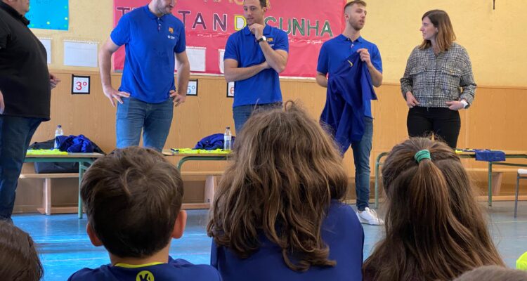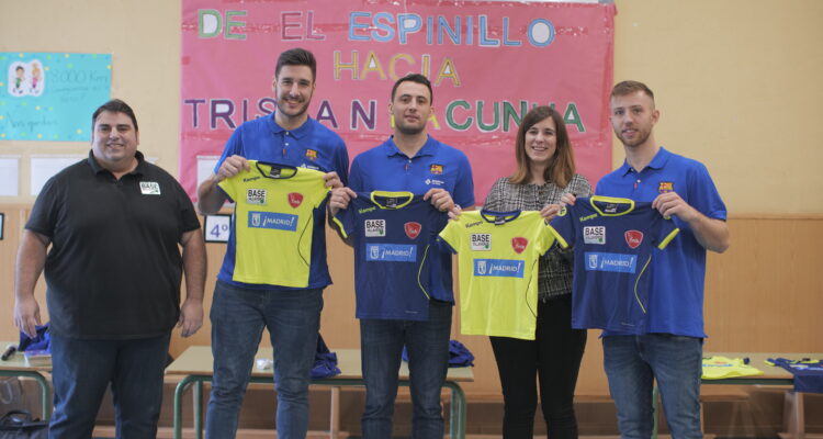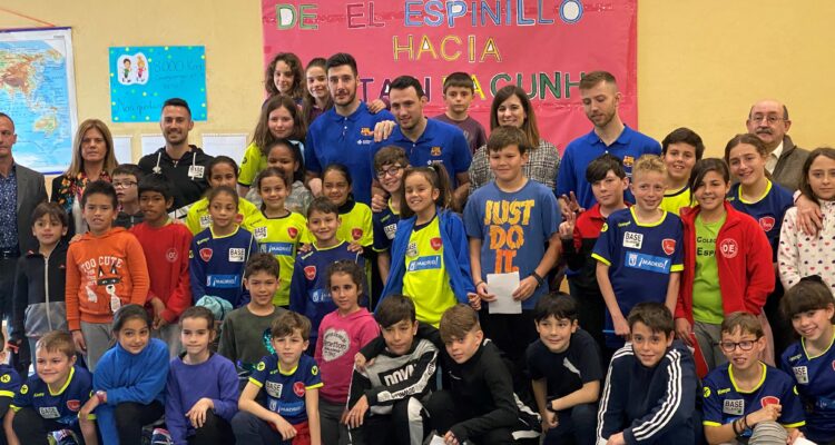Deportistas en edad escolar de Villaverde han recibido la visita de varios jugadores finalistas de la XLV Copa del Rey de Balonmano que se celebrará desde este viernes y hasta el domingo en la Caja Mágica. Este mediodía, alevines y benjamines, de entre 7 y 11 años, de la Escuela Municipal Deportiva del Colegio Público de Infantil y Primaria El Espinillo, han podido conocer a tres jugadores del F.C Barcelona, entre ellos, dos ‘Hispanos’ (bicampeones de Europa), Aitor Ariño, Aleix Gómez y Abel Serdio.