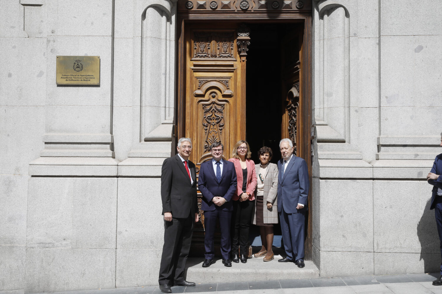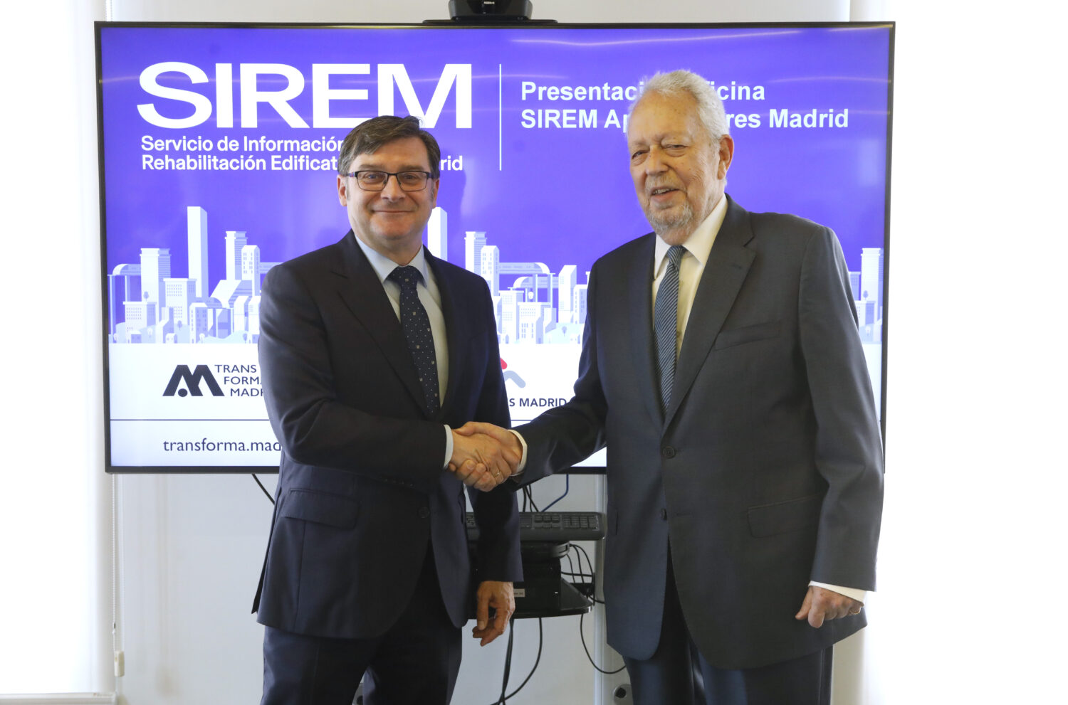 El delegado de Políticas de Vivienda y presidente de la Empresa Municipal de la Vivienda y Suelo (EMVS Madrid), Álvaro González, y el presidente del Colegio Oficial de Aparejadores y Arquitectos Técnicos de Madrid (COAATM), Jesús Paños, han inaugurado esta mañana la segunda oficina técnica del servicio de información sobre la rehabilitación edificatoria de Madrid (SIREM), en la sede de este colegio profesional.