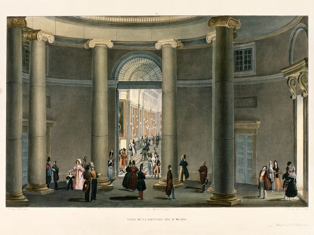 El Museo del Prado fue fuente de inspiración y trabajo para los pintores y grabadores españoles y extranjeros. Como espacio abierto a la visita y a la copia de obras de los grandes maestros de la pintura española, atrajo la atención de los artistas del siglo XIX. En esta ocasión, una de las obras de nuestras colecciones, la litografía estampada por Andreas Pic de Leopold, según dibujo de Fernando Brambila, y titulada ‘Rotonda del Real Museo’, nos habla de ese ambiente de contemplación del arte y del interés que suscitaba la importante colección real. Entonces era ya un atractivo turístico de la capital y Fernando Brambila, entre otros, supo trasmitir esas sensaciones impregnadas de la estética romántica de la época.