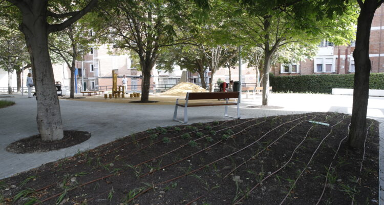 En cuanto a la vegetación, el arbolado actual, maduro y compuesto principalmente por castaños de indias, se ha reforzado con dos nuevos arces, que favorecerán la sombra y el refugio en los meses cálidos. Además, en los parterres se han plantado diferentes especies de plantas.