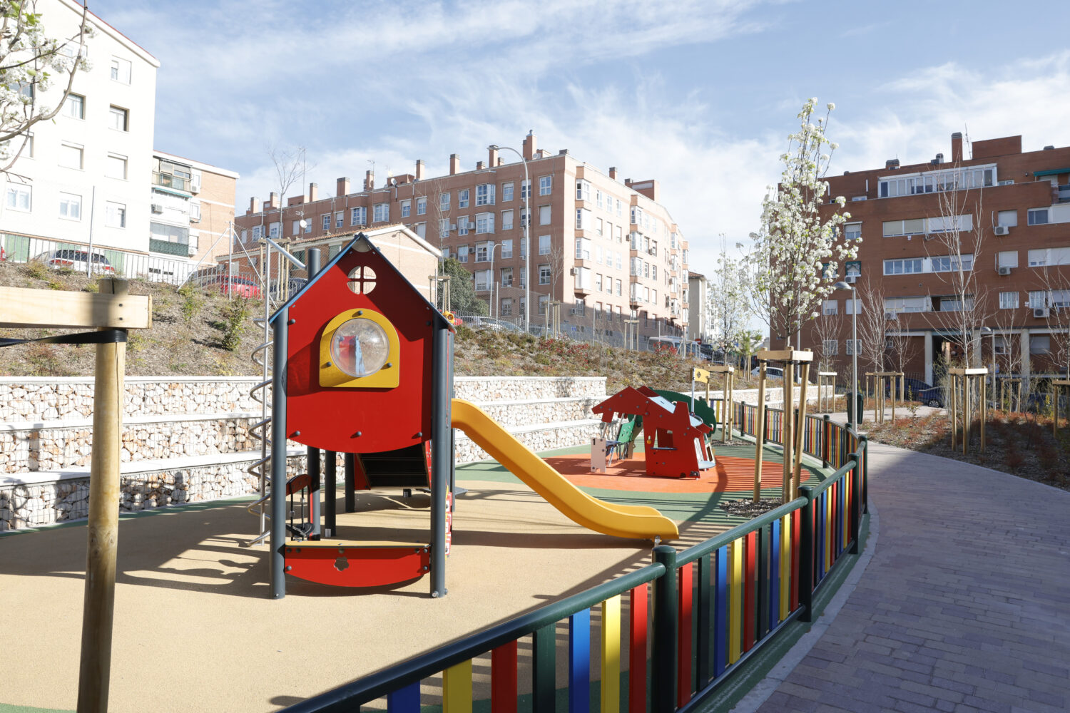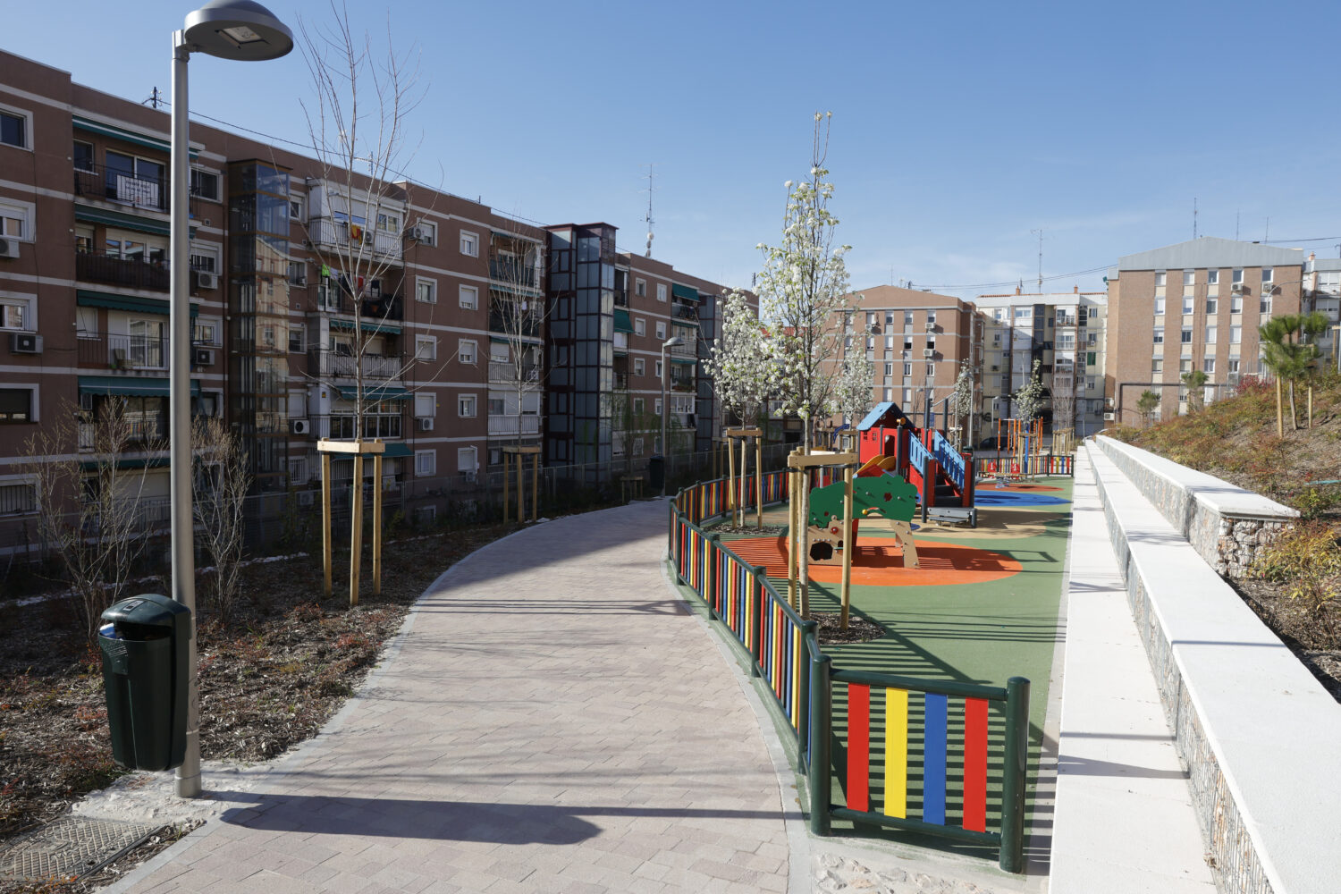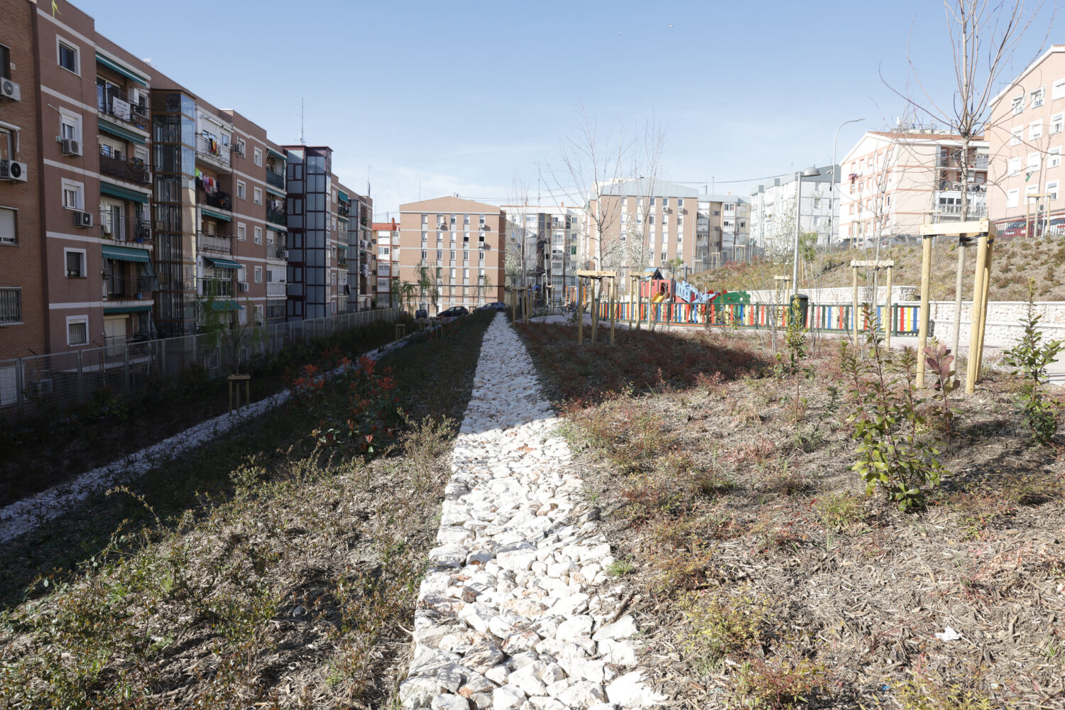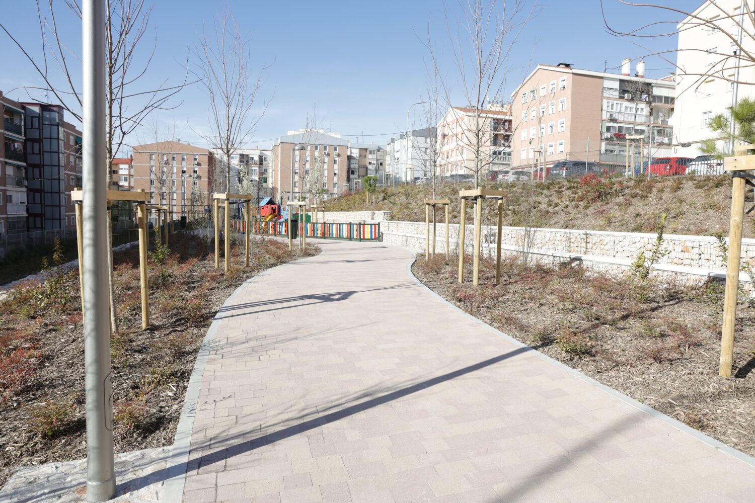 Asimismo, se han instalado redes de drenaje de aguas pluviales, alumbrado público con tecnología led, riego automático y una fuente de agua potable conectada a la red del Canal de Isabel II. El proyecto también incorpora soluciones de drenaje urbano sostenible que facilitan la infiltración del agua de lluvia en el terreno.