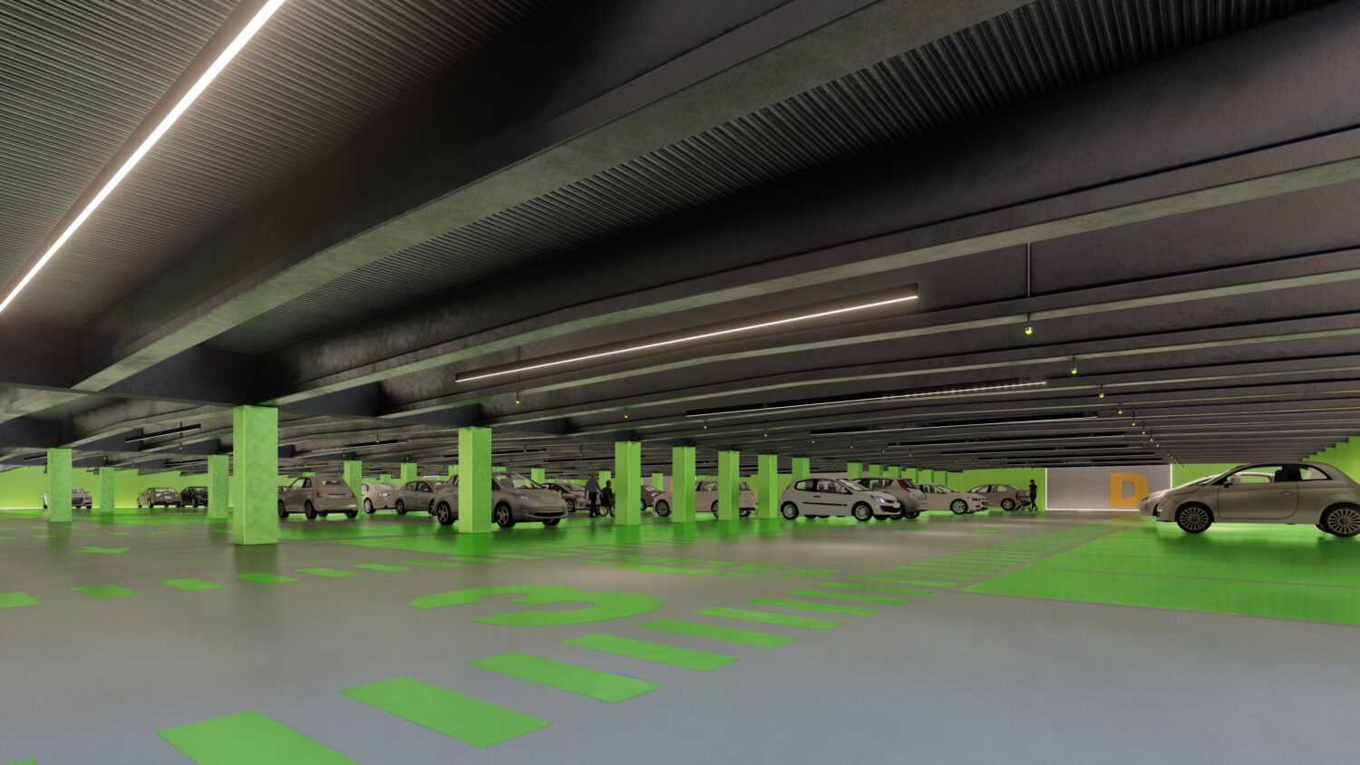 La actuación en el aparcamiento consiste básicamente en rehabilitar el inmueble a nivel constructivo para solucionar las patologías existentes, lograr una conexión con un aparcamiento adyacente y actualizar el diseño y las instalaciones para dotar al inmueble de las exigencias técnicas y funcionales que permitan una óptima gestión del aparcamiento y una implantación de usos versátil, eficiente y competitiva.