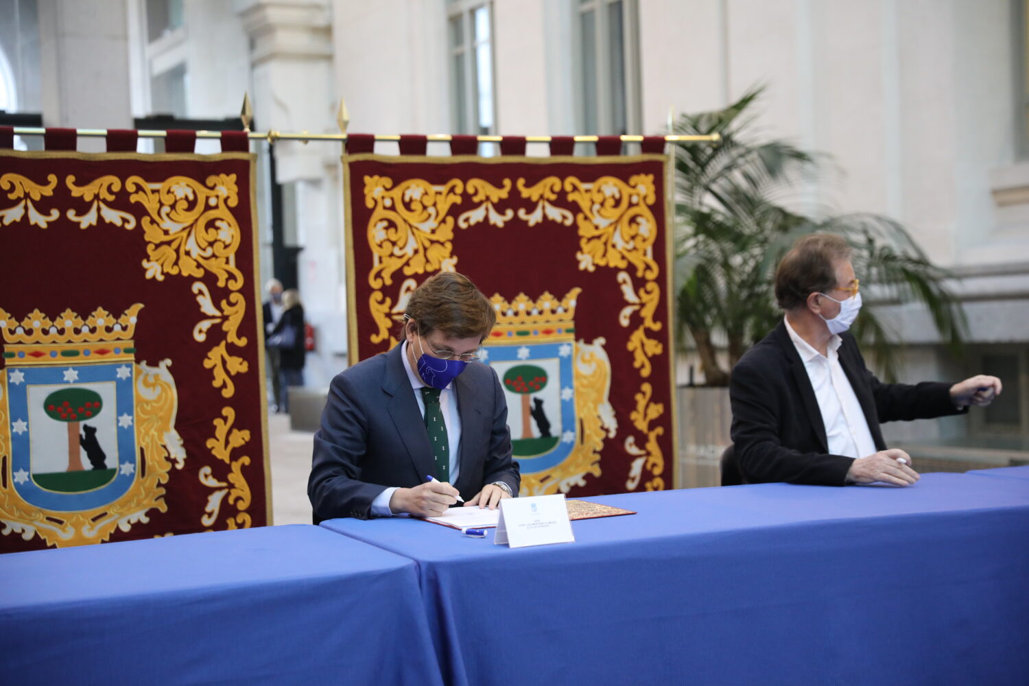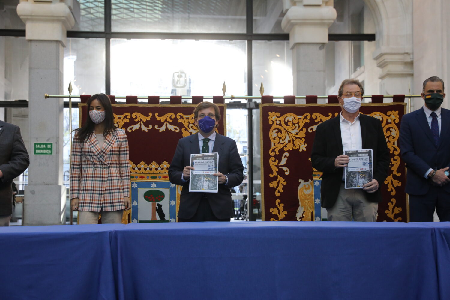 El alcalde Madrid, José Luis Martinez-Almeida, acompañado de la vicealcaldesa, Begoña Villacís, y de representantes de los grupos políticos municipales, ha firmado esta mañana en el Palacio de Cibeles con los principales agentes sociales de la ciudad el Plan de Empleo 2020-2023 que tiene tres ejes básicos: la reactivación económica de la capital tras la crisis sanitaria de la COVID-19, la innovación empresarial e institucional y la dinamización del mercado laboral. El plan está dotado con 2.000 millones de euros, tiene 13 objetivos de actuación con 170 medidas concretas y nace para abordar los efectos de la pandemia, apostando por la formación y la reorientación laboral para mejorar la empleabilidad, por los cuidados y la atención personal y hace especial hincapié en el desarrollo del sureste de Madrid.