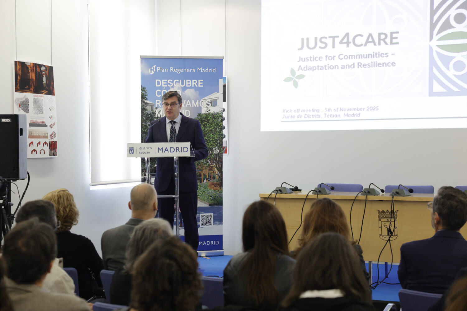 El delegado de Políticas de Vivienda y presidente de la Empresa Municipal de la Vivienda y Suelo (EMVS Madrid), Álvaro González, acompañado por la concejala de Tetuán, Paula Gómez-Angulo, ha presidido hoy, en la junta municipal del distrito, el lanzamiento del proyecto europeo JUST4CARE, una iniciativa del programa Horizon Europe, dentro de la Misión de Adaptación al Cambio Climático, que busca impulsar la resiliencia urbana con un enfoque centrado en la justicia social y la equidad.