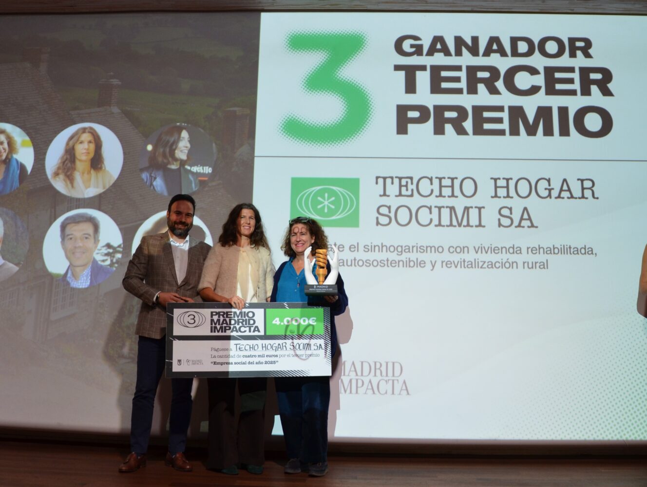 Y el tercer premio, con una dotación de 4.000 euros, ha recaído en Techo Hogar SOCIMI por su proyecto tuTECHÔ, que combate el sinhogarismo mediante la rehabilitación de viviendas para personas vulnerables con un modelo autosostenible y escalable. Hasta ahora, ha alojado a más de 2.400 personas y ha generado un ahorro público de 23,6 millones de euros. Su iniciativa rural revitaliza pueblos despoblados conectando vivienda y empleo.