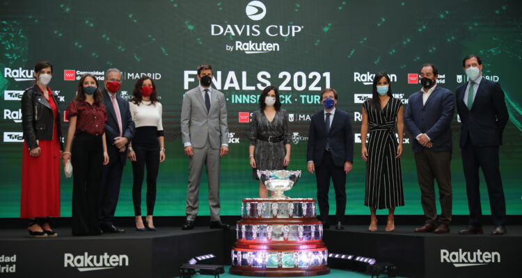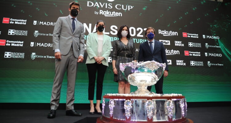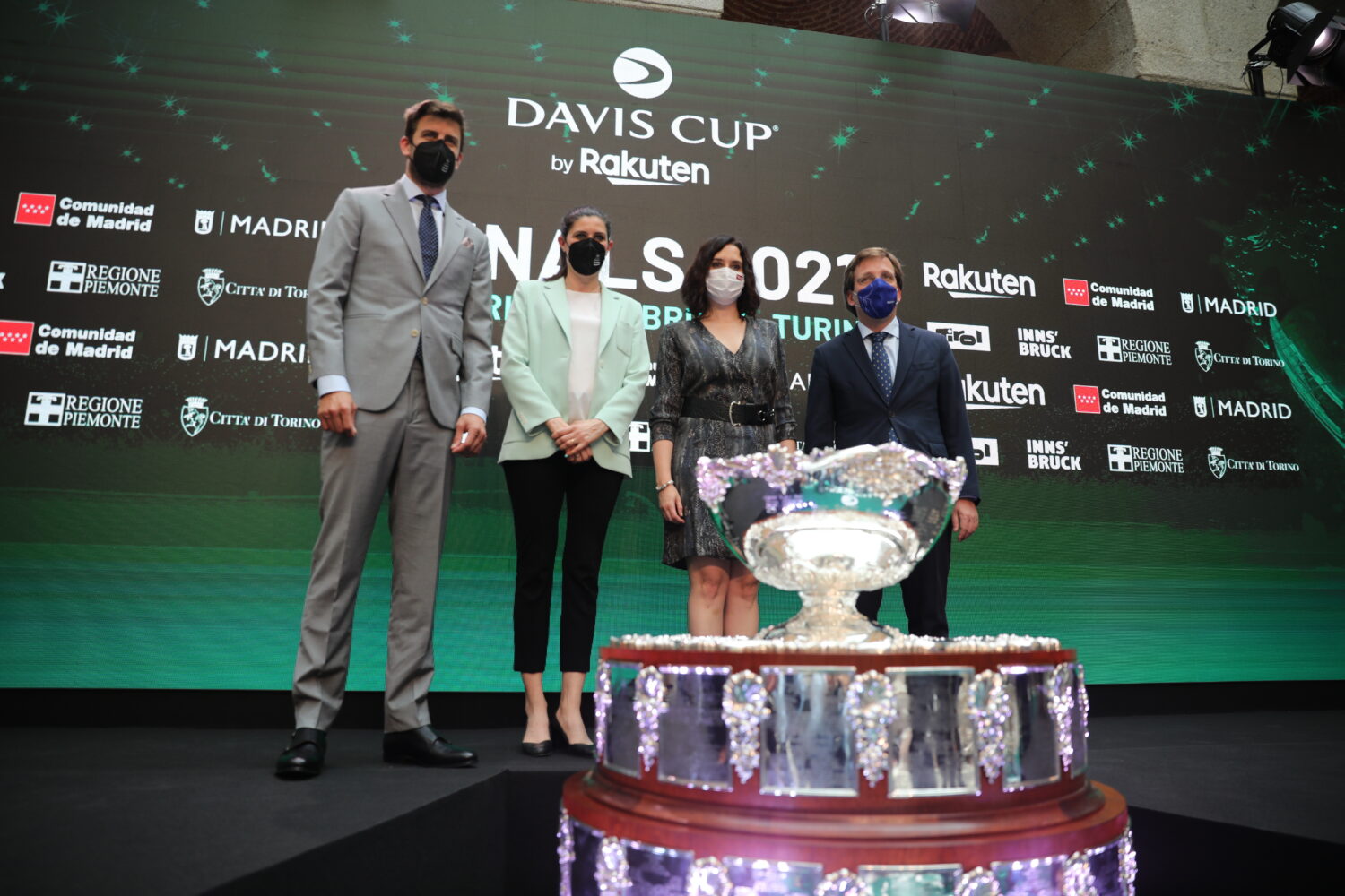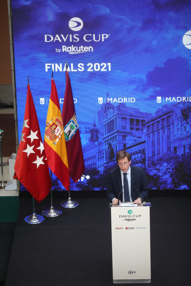 El alcalde de Madrid, José Luis Martínez-Almeida, acompañado de la vicealcaldesa, Begoña Villacís; la delegada de Cultura, Turismo y Deporte, Andrea Levy, y la concejala delegada de Deporte, Sofía Miranda, ha participado este mediodía en la presentación de la Davis Cup by Rakuten Finals 2021, que se celebrará en la ciudad de Madrid, junto a Innsbruck (Austria) y Turín (Italia), entre el 25 de noviembre y el 5 de diciembre. La capital española se mantiene como sede principal gracias al apoyo del Ayuntamiento con la cesión gratuita del Madrid Arena y una aportación de 2,5 millones de euros.