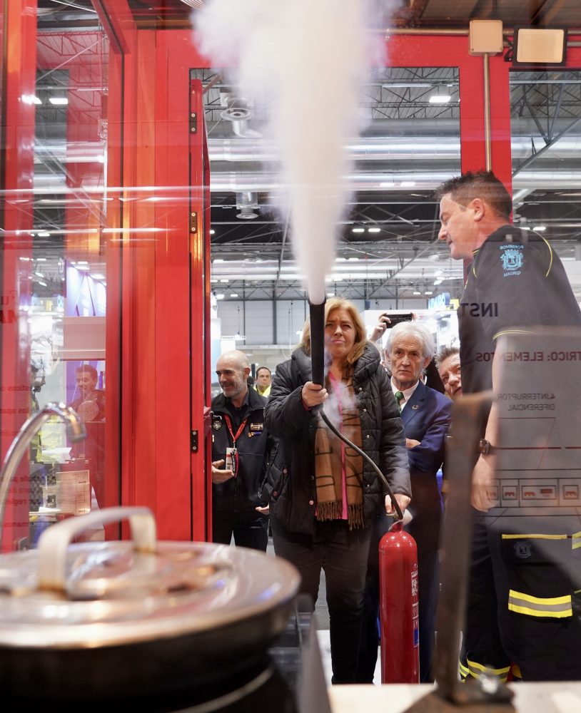 Bomberos de Madrid, por último, muestra un vehículo auto escala y su aula experimental donde imparten formación en prevención para actuar ante incendios y prevenir sus riesgos (con una zona expresamente para los derivados de la electricidad, los productos de limpieza, etc., y otra para actuar ante los riesgos de las cocinas). /