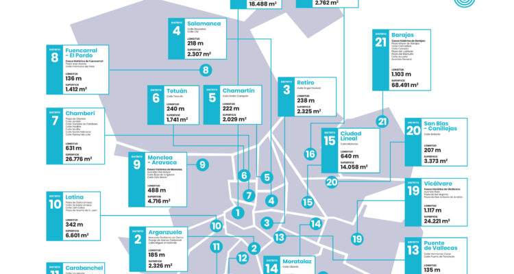 Los distritos que ganarán más espacio para el peatón serán Barajas (68.491 m2), Chamberí (26.766 m2), Vicálvaro (24.221 m2), Centro (18.488 m2), Ciudad Lineal (14.058 m2) y Usera (8.080 m2) seguidos de Latina (6.601 m2), Moncloa-Aravaca (4.716 m2), Carabanchel (4.586 m2), San Blas-Canillejas (3.372 m2), Villa de Vallecas ( 3.360 m2), Moratalaz (3.039 m2), Hortaleza (2.762 m2), Arganzuela (2.326 m2), Retiro (2.325 m2), Salamanca (2.307 m2), Chamartín (2.029 m2), Tetuán (1.741 m2), Villaverde (1.483 m2), Fuencarral-El Pardo (1.412 m2) y Puente de Vallecas (1.276 m2).