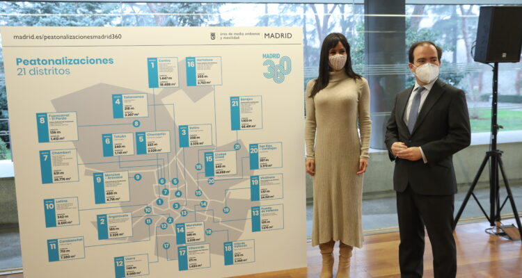 Madrid cambiará su fisonomía desde este mes para convertir 203.440 m2 en espacio cero emisiones de manera definitiva, una superficie equivalente a 18 veces la Puerta del Sol (10.900 m2). Esta transformación será posible gracias a la conversión de 10 kilómetros lineales de calzada, por donde actualmente circulan vehículos, en tramos peatonales. La vicealcaldesa de Madrid, Begoña Villacís, junto al delegado de Medio Ambiente y Movilidad, Borja Carabante, y la delegada del Área de Obras y Equipamientos, Paloma García Romero, ha presentado esta mañana, en los Jardines de Cecilio Rodríguez, las 21 peatonalizaciones que se llevarán a cabo progresivamente desde diciembre y hasta principios de año y que afectan a 48 tramos de los 21 distritos de la capital. Estas actuaciones eliminarán de todas estas zonas 14,6 millones de vehículos anuales, 40.000 vehículos al día.