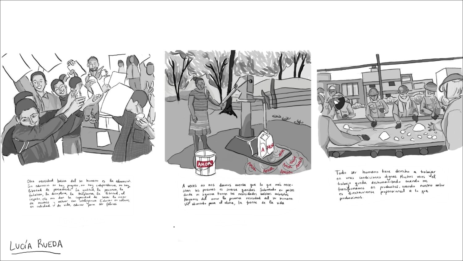 En su segunda edición, el certamen ha reconocido tanto la calidad de los dibujos como la forma de captar la esencia de los proyectos más importantes desarrollados por las ONGD. Los ganadores han sido Lucía Rueda, alumna de la Facultad de Geológicas de la Universidad Complutense de Madrid, que ha recibido el primer premio por su propuesta Lo que de verdad importa/crítica a la sociedad; Irene Vela, alumna de Diseño y Arquitectura de la Universidad Rey Juan Carlos I, segundo premio por Construyendo el futuro y María Gárgoles, alumna de Bellas Artes de la Universidad Complutense de Madrid, tercer premio por las ilustraciones que llevan por título ¡Todos cooperamos!. /