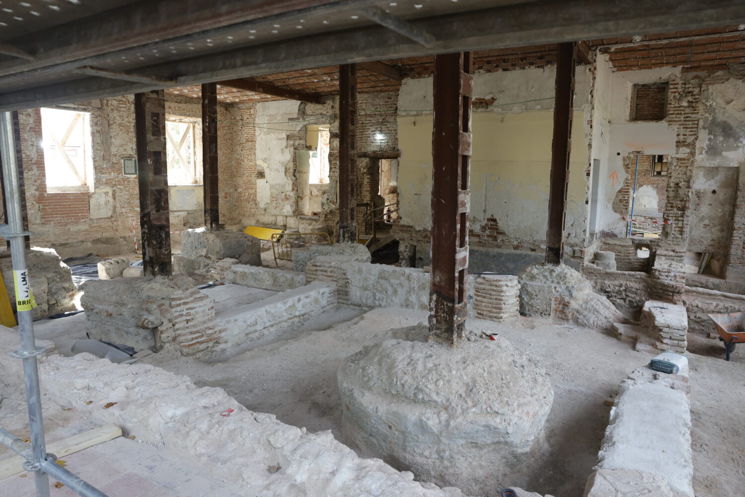 Las excavaciones realizadas recientemente -primeros pasos de este trabajo de recuperación- han puesto al descubierto los arranques de los muros de la casa del siglo XVI, cuya organización interna se mantuvo prácticamente intacta hasta el siglo XX. También han aparecido pavimentos originales de los siglos XVI, XVII y XVIII, especialmente en el pabellón occidental, así como azulejos mudéjares, basas y capiteles, una columna del siglo XVI integrada en un muro posterior, restos de chimeneas, estructuras de escaleras desaparecidas y vigas originales en la sala central. Todos estos hallazgos permitirán recuperar no solo la arquitectura del edificio, sino también la historia de quienes lo habitaron y transformaron a lo largo del tiempo.