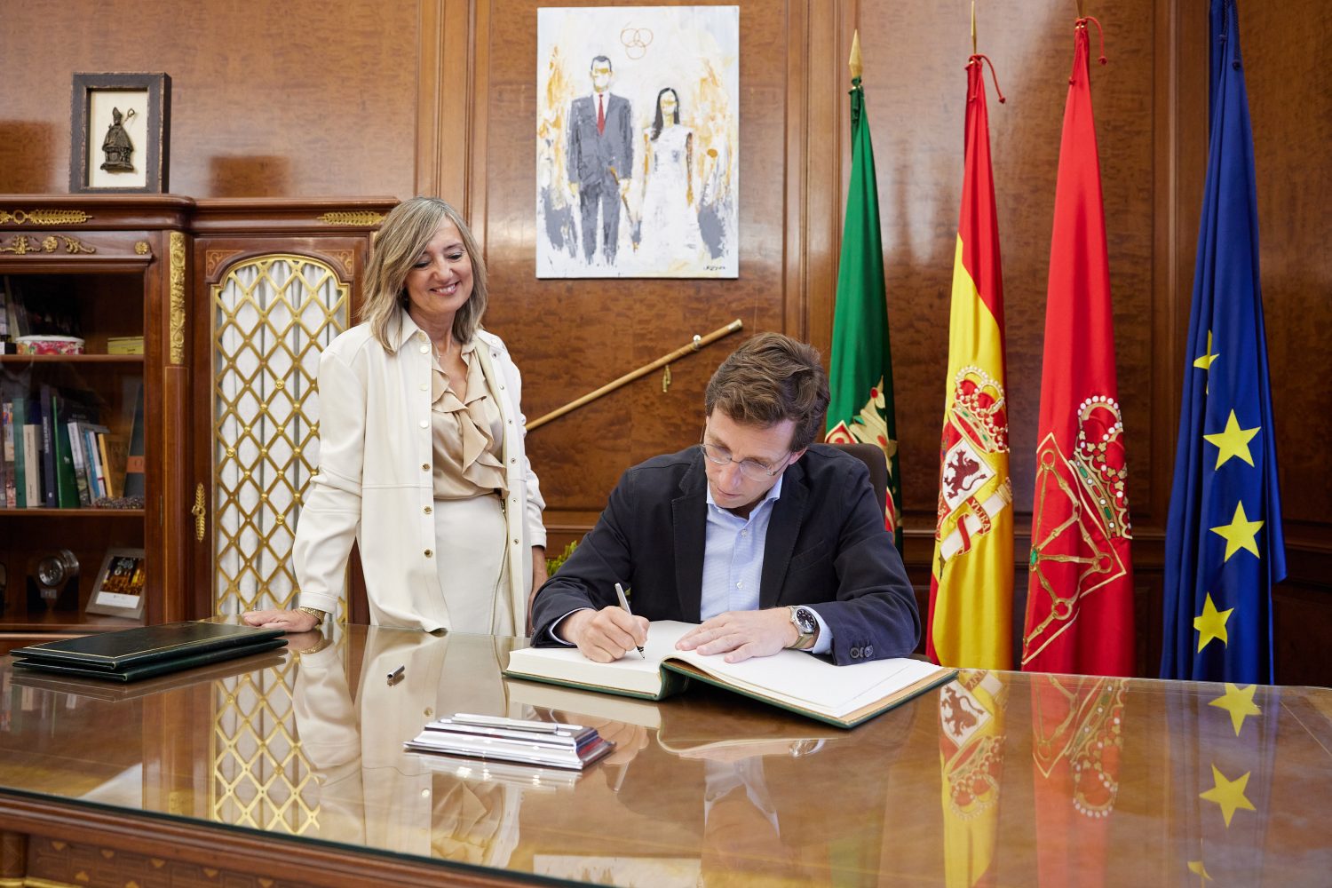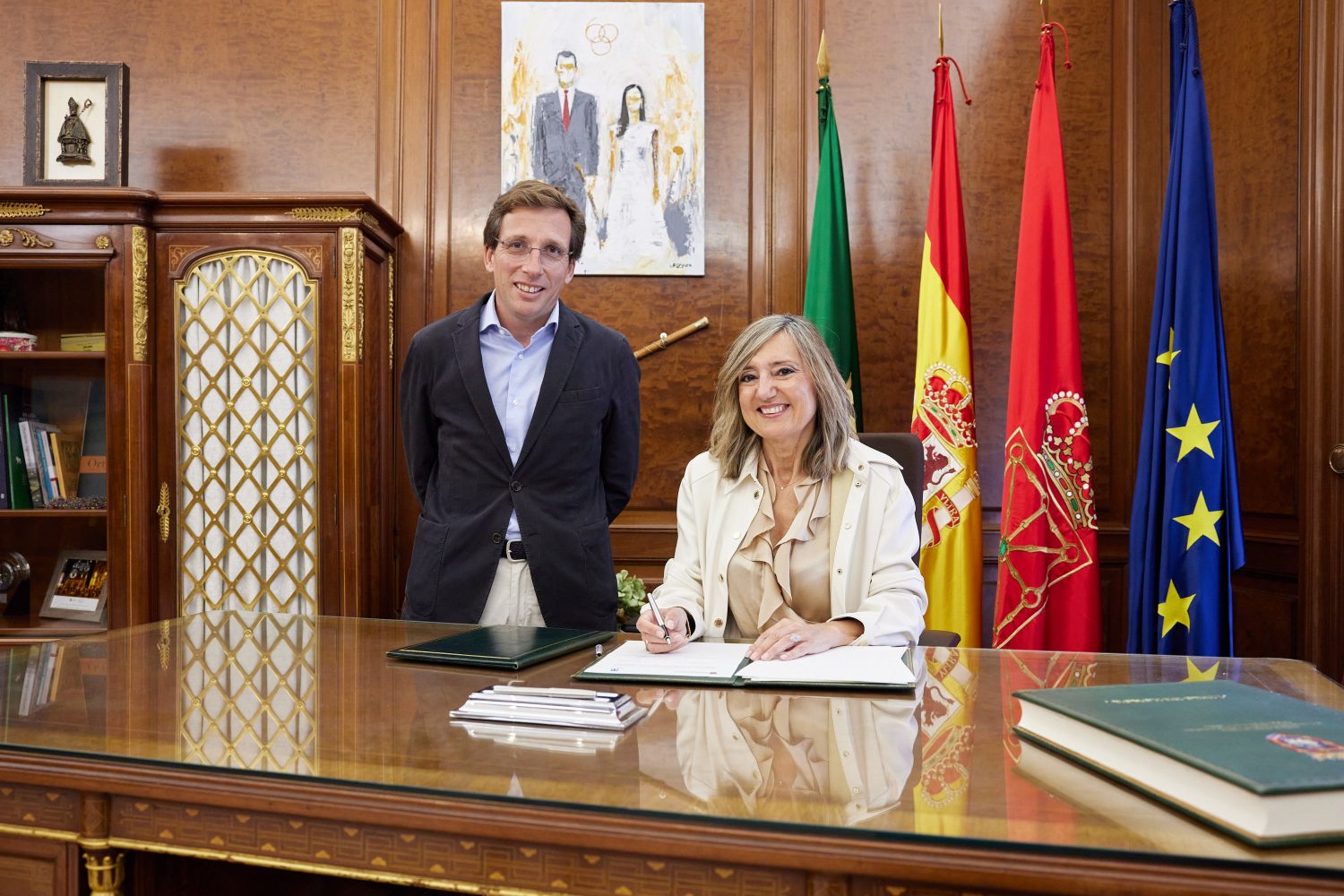 El alcalde de Madrid, José Luis Martínez-Almeida, y la alcaldesa de Pamplona, Cristina Ibarrola, se han reunido hoy en la capital navarra, donde han firmado un convenio de colaboración con la finalidad de fomentar e intercambiar acciones entre ambas ciudades en materia turística, cultural y gastronómica.