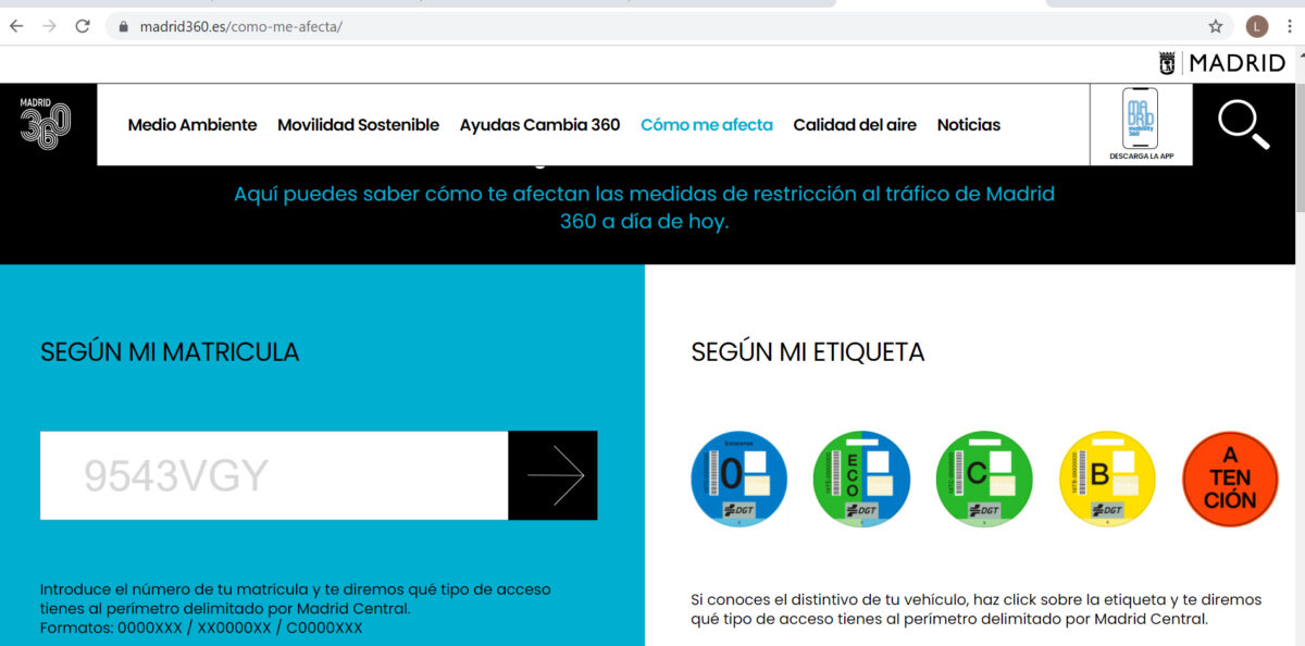 La sección clave de la web es el menú ‘Cómo me afecta’, donde el usuario puede introducir la matrícula de un vehículo e informarse de las posibles restricciones en las ZBE de la capital según su distintivo ambiental. De esta forma, el interesado podrá confirmar si puede acceder al distrito de Centro o las condiciones de acceso, si puede circular en casos de escenarios por alta contaminación o si su etiqueta no es compatible en una Zona de Bajas Emisiones como plaza Elíptica, por ejemplo.