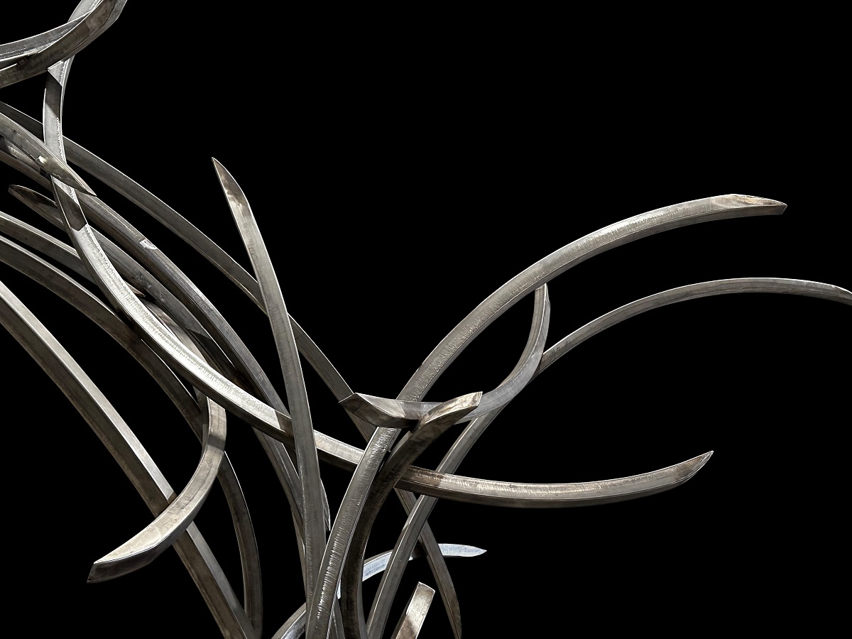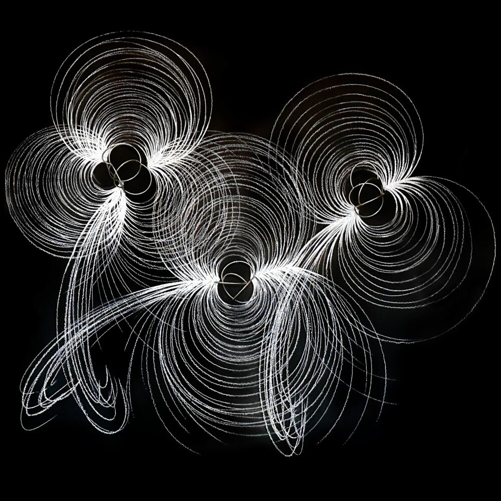 Las piezas se presentan en tres segmentos: ‘Disimetría’, ‘Gravitación’ y ‘Energía’. Todos ellos comparten un lenguaje genuinamente sensorial y abstracto, en el que se entrelazan conceptos de opuestos: simetría y asimetría, atracción y expansión, luz y oscuridad, materia y antimateria, y un tiempo en el que presente, pasado y futuro convergen en un mismo espacio temporal. Un lenguaje en el que destaca la presencia persistente de la línea curva, círculos completos que se combinan con líneas circulares o elípticas, fragmentadas, rotas y que se atraen entre sí formando nuevos universos.