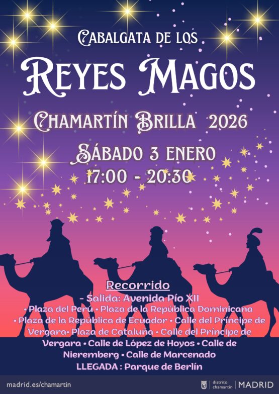 Ya está todo listo para recibir en Chamartín a Sus Majestades los Reyes Magos. La cabalgata de Reyes 2025, una de las primeras de la ciudad, saldrá el sábado 3 de enero, a las 17:00 horas, desde la avenida de Pío XII hasta el parque de Berlín, tras recorrer las céntricas calles del Príncipe de Vergara, López de Hoyos, Nieremberg y Marcenado. Este año, entre comparsas y carrozas, se alcanzará un récord de participación con más de 1.300 niños, un 45 % más que en 2025, además de músicos, entre otros artistas. Se repartirán 6.000 kilos de caramelos y volverá a circular una carroza accesible a la que pueden subir personas con movilidad reducida.