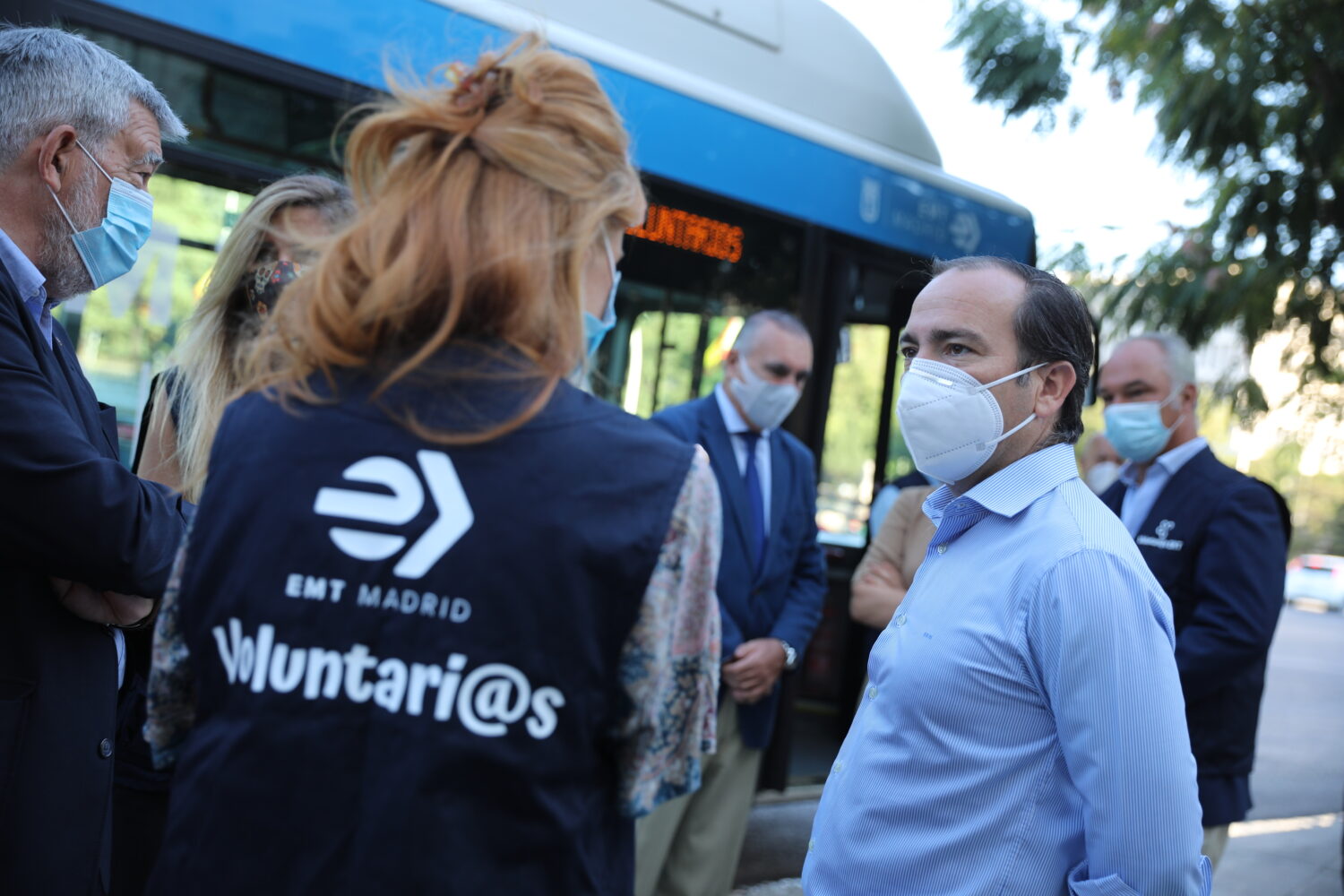 El delegado de Medio Ambiente y Movilidad del Ayuntamiento de Madrid, Borja Carabante, y el gerente de la EMT, Alfonso Sánchez, han presentado esta mañana una nueva acción solidaria promovida por voluntarios de la EMT que, junto a otros de Cáritas Madrid, van a recoger material escolar para familias en riesgo de exclusión social mañana sábado 12 de septiembre. Al acto de presentación también han acudido el director de Cáritas Diocesana de Madrid, Luis Hernández; la concejala de Charmartín, Sonia Cea, y la directora de RSC y Comunicación Externa de Alcampo, Yolanda Fernández. Esta es la segunda iniciativa de estas características del autobús solidario de la EMT.