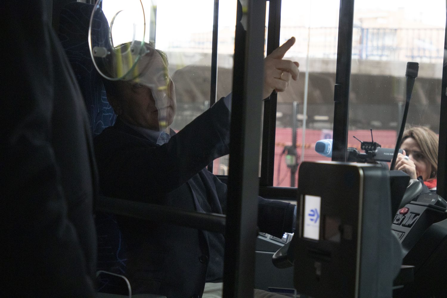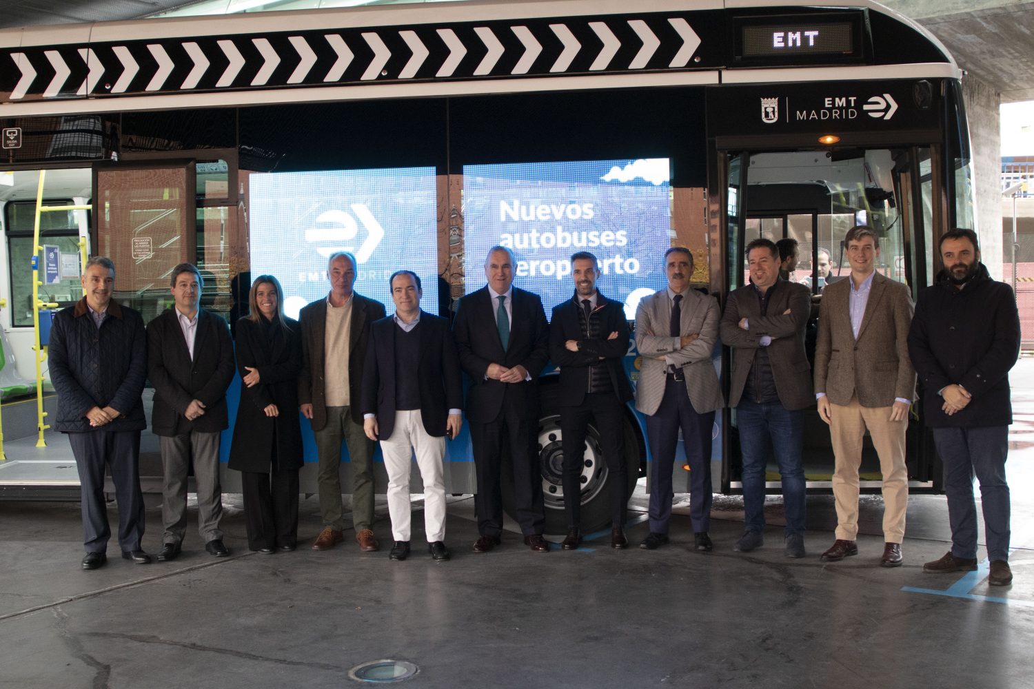 El delegado de Medio Ambiente y Movilidad, Borja Carabante, acompañado por el director gerente de la Empresa Municipal de Transportes (EMT), Alfonso Sánchez, ha presentado esta mañana el nuevo modelo de autobús que se incorporará este mismo mes de diciembre en la línea 200, que conecta avenida de América con las terminales de Barajas, y en los próximos meses, en la línea Exprés Aeropuerto.