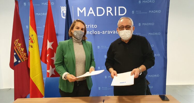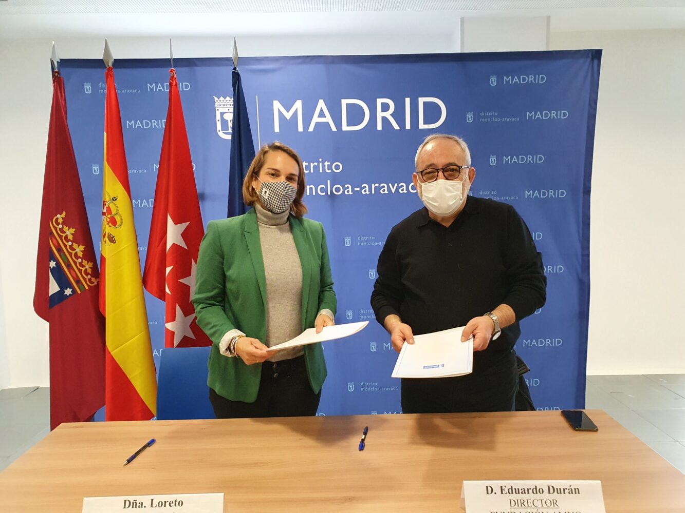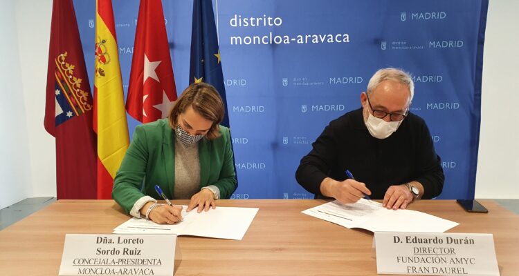 La concejala del distrito de Moncloa-Aravaca, Loreto Sordo, y el director de la Fundación AMYC-Fran Daurel, Eduardo Durán, han firmado un convenio de colaboración para impulsar la actividad cultural y dar a conocer la labor de esta fundación en el distrito.