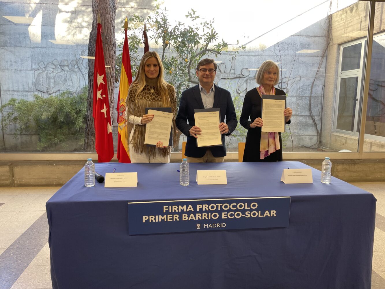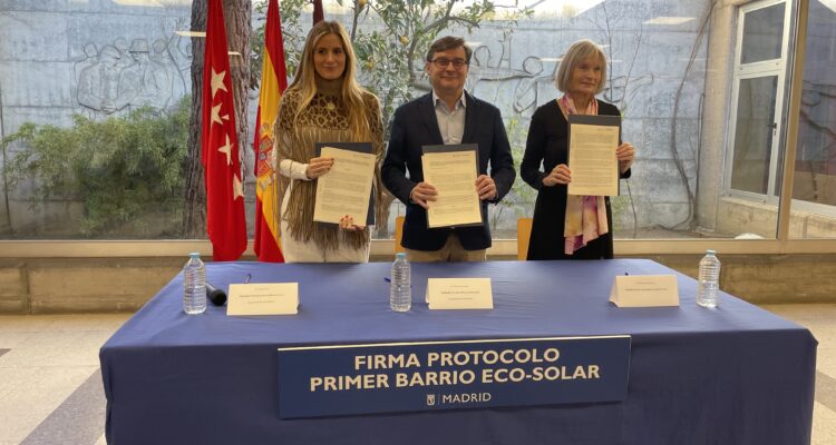 El delegado de Políticas de Vivienda y presidente de la Empresa Municipal de la Vivienda y Suelo (EMVS Madrid), Álvaro González, y la concejala de Usera, Sonia Cea, han firmado esta mañana un protocolo de actuación para el impulso y constitución de una comunidad energética en el Poblado Dirigido de Orcasitas, junto a la presidenta de la comunidad energética local, Manuela Navarro, en representación de los vecinos que se unen a la iniciativa.
