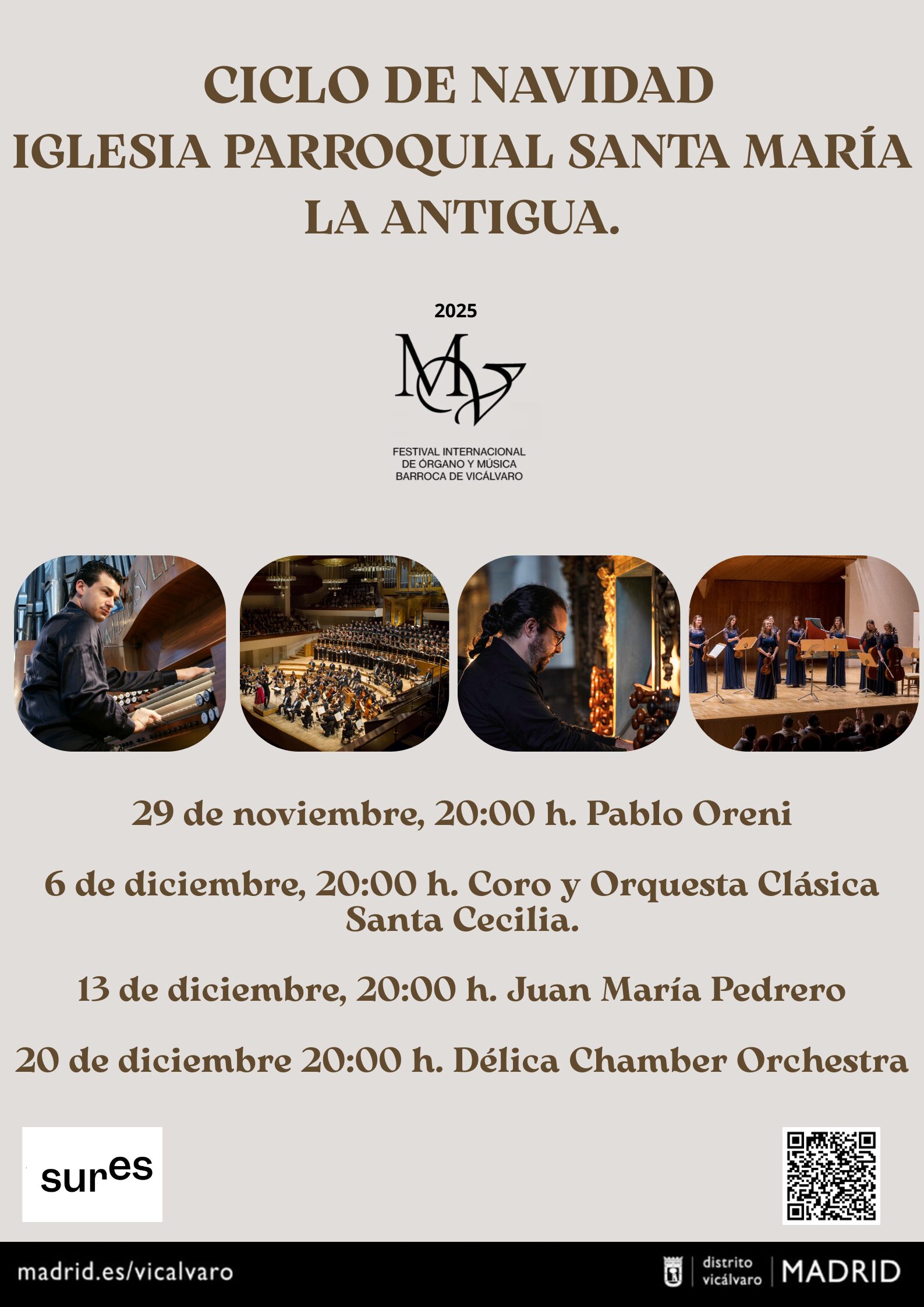 El ciclo, gratuito y organizado por la junta municipal con la colaboración de la Parroquia de Santa María La Antigua y el apoyo del Plan SURES del Ayuntamiento de Madrid, arrancará con la actuación del italiano Pablo Oreni el próximo 29 de noviembre. Le seguirá el Coro y Orquesta Clásica Santa Cecilia el 6 de diciembre, Juan María Pedrero el 13 de diciembre y cerrará el ciclo Délica Chamber Orchestra el 20 de diciembre. Todos los conciertos serán a las 20:00 horas, con entrada libre hasta completar aforo.
