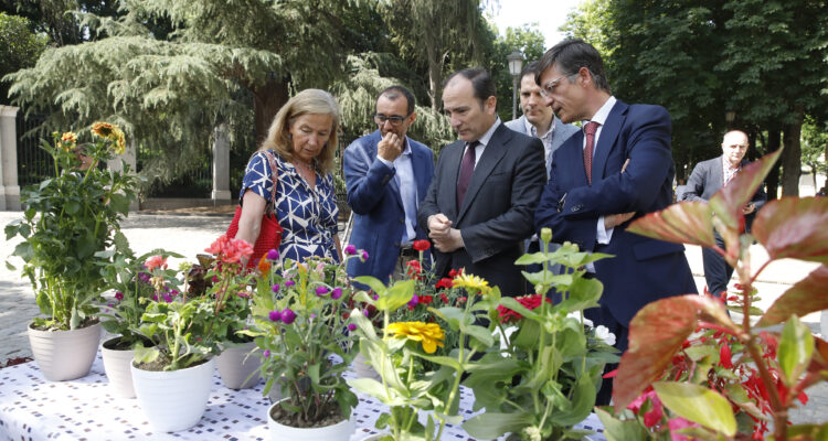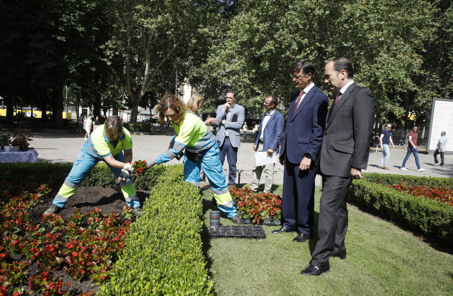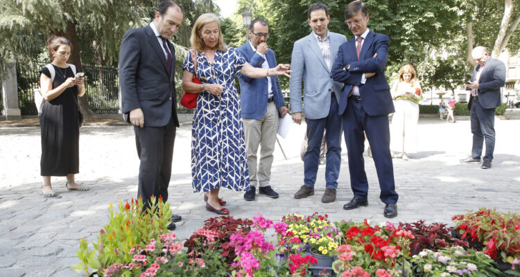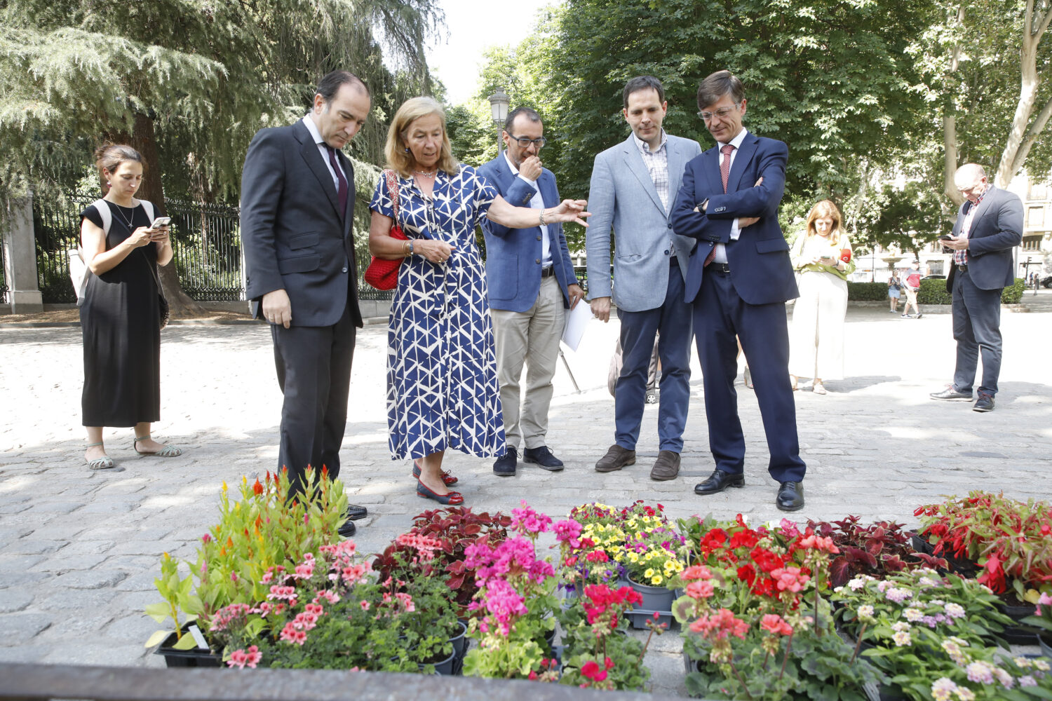 El delegado de Urbanismo, Medio Ambiente y Movilidad, Borja Carabante, acompañado por el concejal delegado de Limpieza y Zonas Verdes, José Antonio Martínez Páramo, ha visitado esta mañana la plaza de Murillo, en el distrito de Retiro, para poner el broche final a la campaña de plantación de flor de temporada primavera-verano.