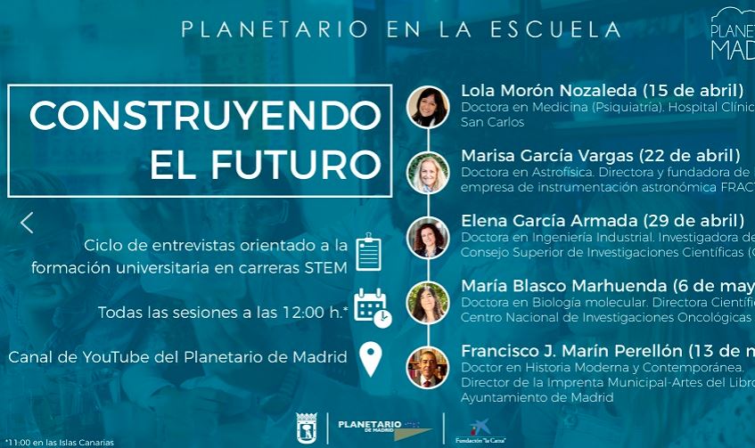 Planetario de Madrid celebrará a partir del 15 de abril y durante cinco jueves consecutivos ‘Construyendo el futuro…’, un ciclo de conferencias protagonizadas por cinco eminencias en Biología, Física, Medicina, Ingeniería e Historia que orientarán al alumnado de institutos y colegios sobre las carreras universitarias conocidas como STEM, siglas que hacen referencia a Ciencia (Science), Tecnología (Technology), Ingeniería (Engineering) y Matemáticas (Mathematics).