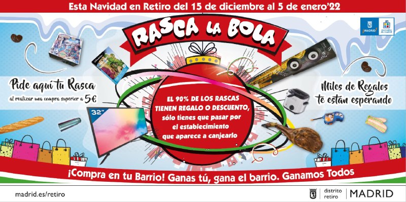 La Junta Municipal de Retiro, en colaboración con los establecimientos del distrito, lanza la campaña ‘Rasca la bola’ con el objetivo de dinamizar el consumo en los comercios del barrio y concienciar a las personas de la importancia de consumir en ellos.