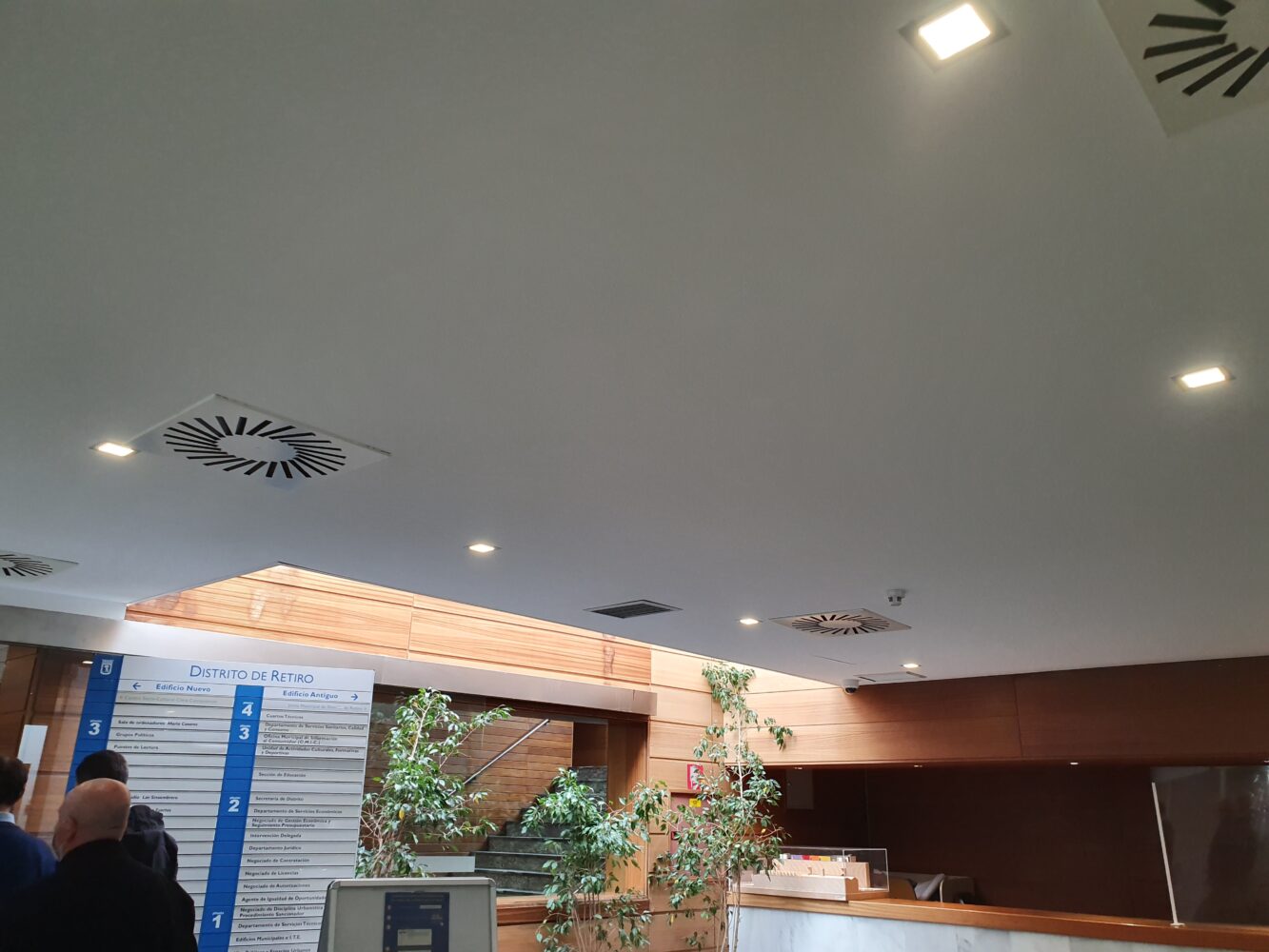 Estas actuaciones han llevado aparejada una obra civil consistente en la demolición de los falsos techos de los vestíbulos de ascensor en las diferentes plantas y patinillo de ventilación, el falso techo de la Oficina de Atención a la Ciudadanía Línea Madrid y los de las salas de la planta tercera.