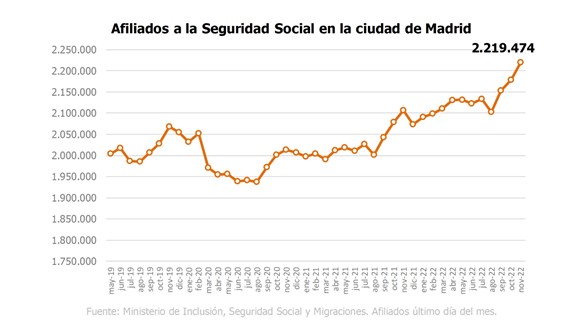La afiliación a la Seguridad Social en la ciudad de Madrid ha alcanzado un récord histórico de 2.219.474 cotizantes en el mes de noviembre, lo que supone un crecimiento del 5,3 % respecto al mismo mes del año pasado, y un crecimiento mayor que el del resto de España, con un 2,6 %. Además, si se comparan los datos de este año con los del mismo mes del año 2019 (previo a la pandemia), el crecimiento es del 7,3 %, con un total de 151.107 afiliados más.