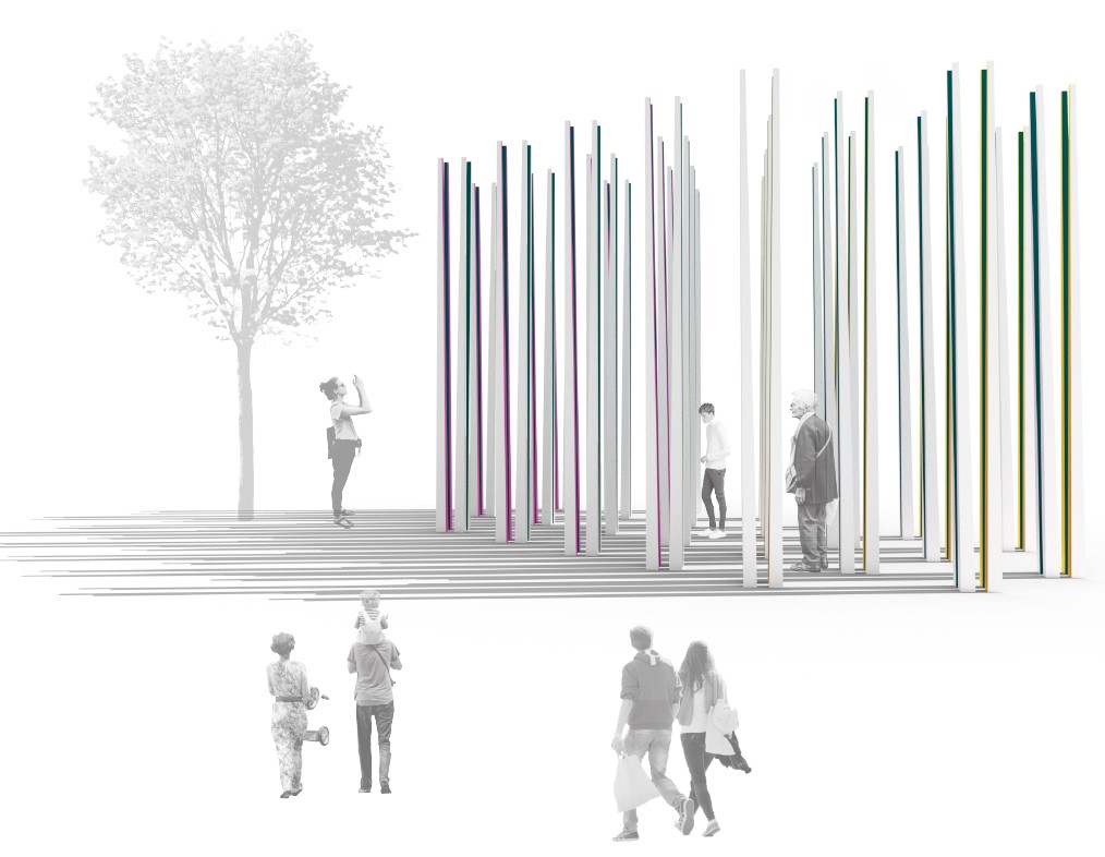 El proyecto artístico, creado por el colectivo Sawu Studio integrado por los arquitectos Pablo García Mena y Aylin Vera Ramos, se compone de 96 prismas dispuestos verticalmente. La cara exterior de estos elementos estará pintada en blanco para simbolizar la inocencia de las personas que pierden la vida por actos sinsentido impuestos por la fuerza. Las caras interiores se teñirán con los colores de la cuatricromía, para expresar con el cian, magenta, amarillo y negro los recuerdos íntimos, la devolución a la vida de las víctimas cuando se las recuerda. Los prismas se dispondrán en grupos de cuatro y con una separación que permita a las personas que visiten el monumento una interacción espacial y lumínica con la pieza artística.